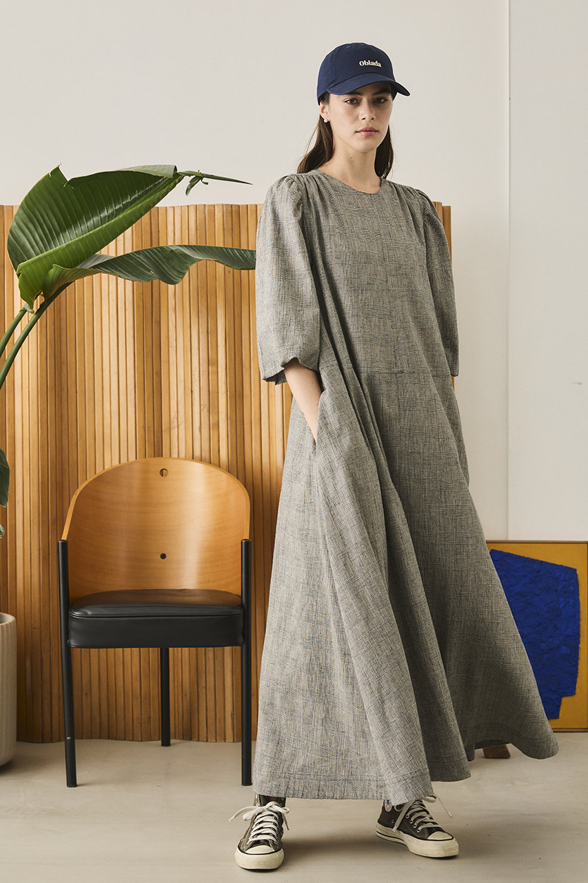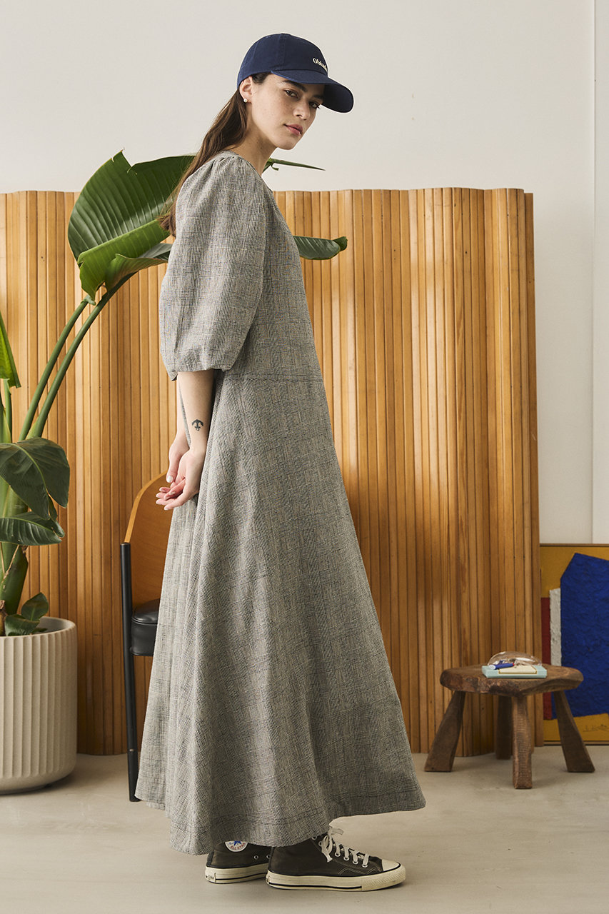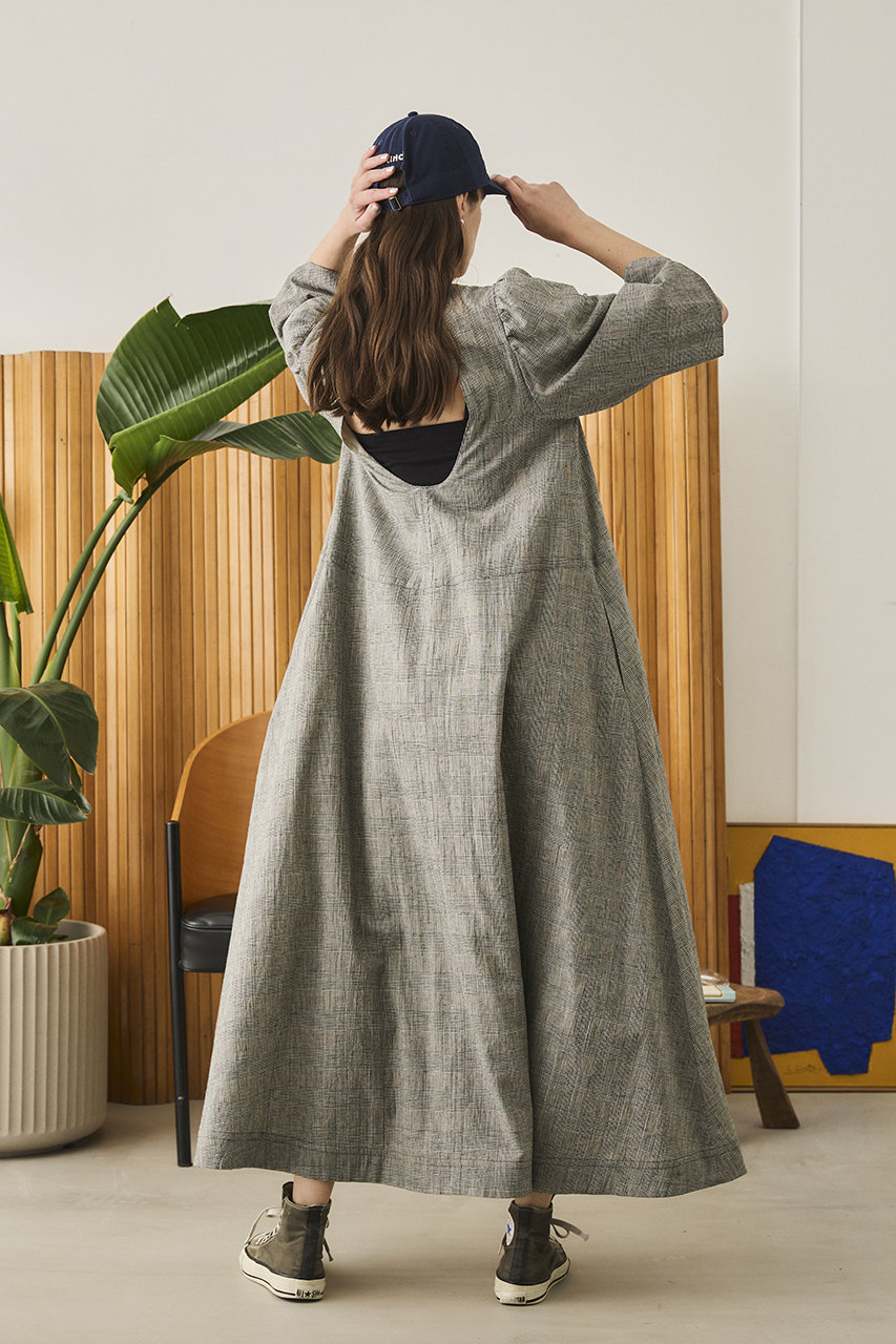 クラシカルな印象のグレンチェックのマキシワンピース。バルーン袖で腕をすっきり見せつつ、背中の大胆な開きが涼しげな抜け感を演出。キャップを合わせれば、オフの日コーデにも◎。