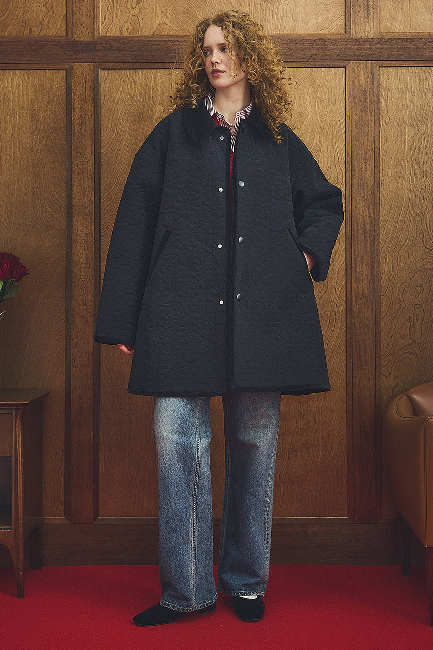 クラシックなムードながら、大きな襟とテントラインのフォルムで女性らしく仕上げたコート。裏地付きで薄手の中綿を使用しているので、端境期にぴったりのあたたかさと軽さを兼ね備えています。