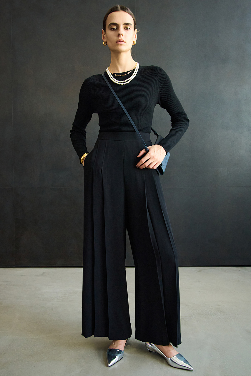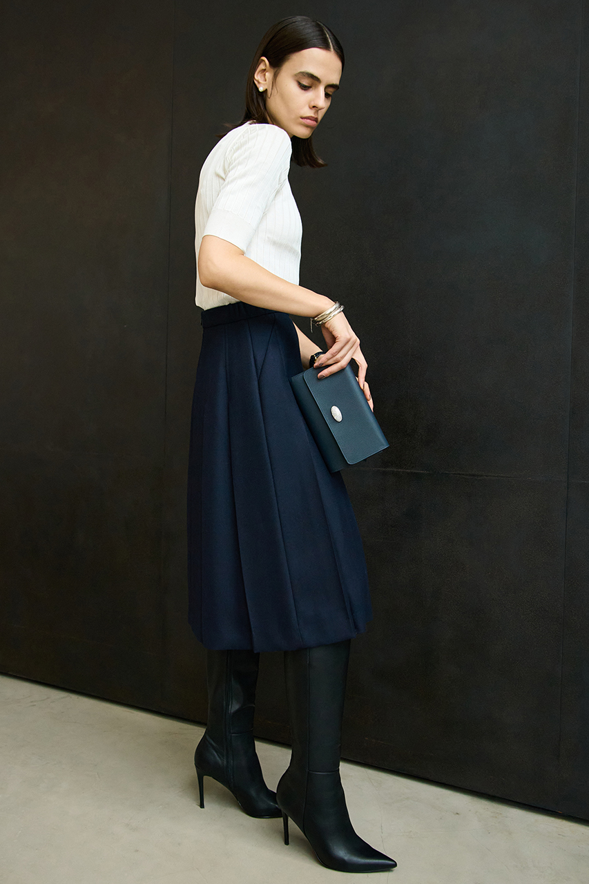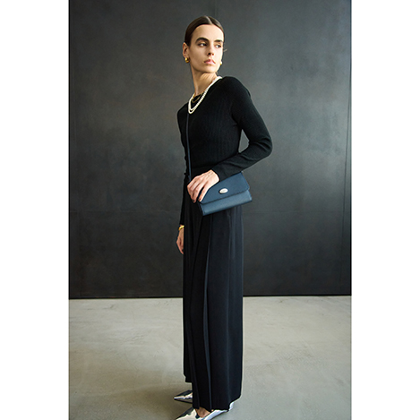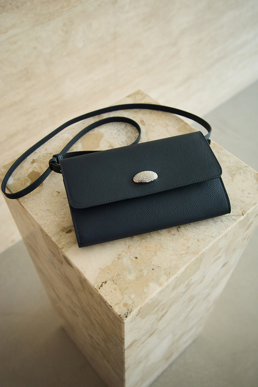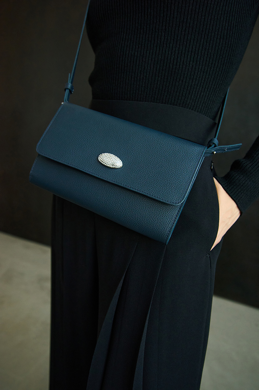 iPhoneやカードなどの必需品をスマートに収納でき、華やかなシーンではクラッチバッグとしても活躍。ネイビーのシボ革は、1950年創業のイタリア「ダニ」社によるアニリン染めで、芯まで美しく発色されており、手にした瞬間の軽やかさと柔らかさが魅力。インサイドは、フィレンツェ近郊「インゴロッペリ」社のゴートスウェードを採用。「エムダブリュー」デザイナーこだわりのビジューボタンがさりげなく気品をプラス。ミリ単位までこだわりが詰まったスペシャルピースです。