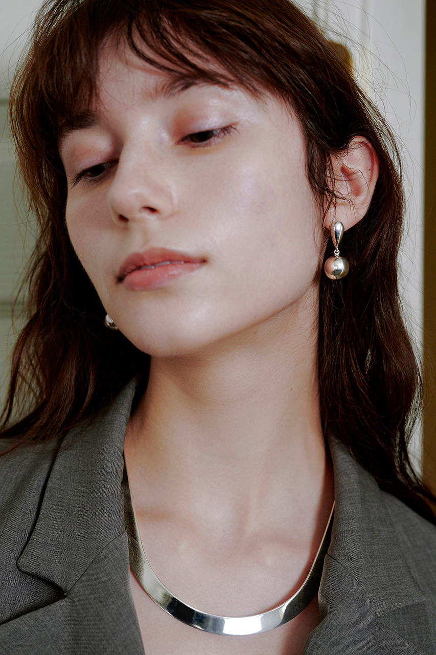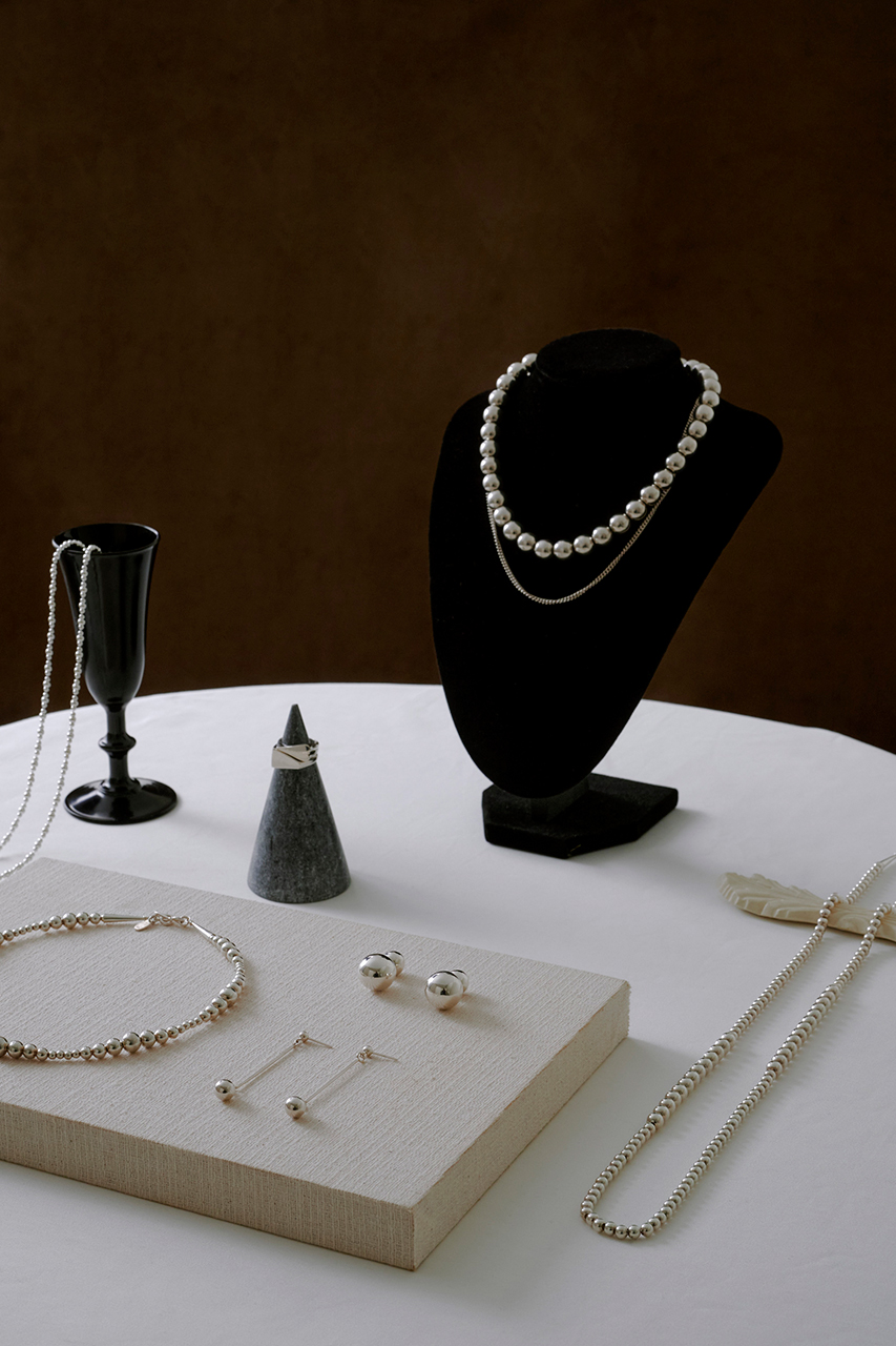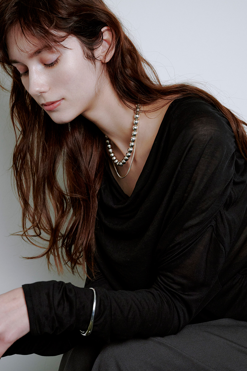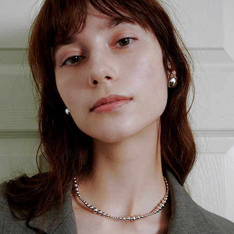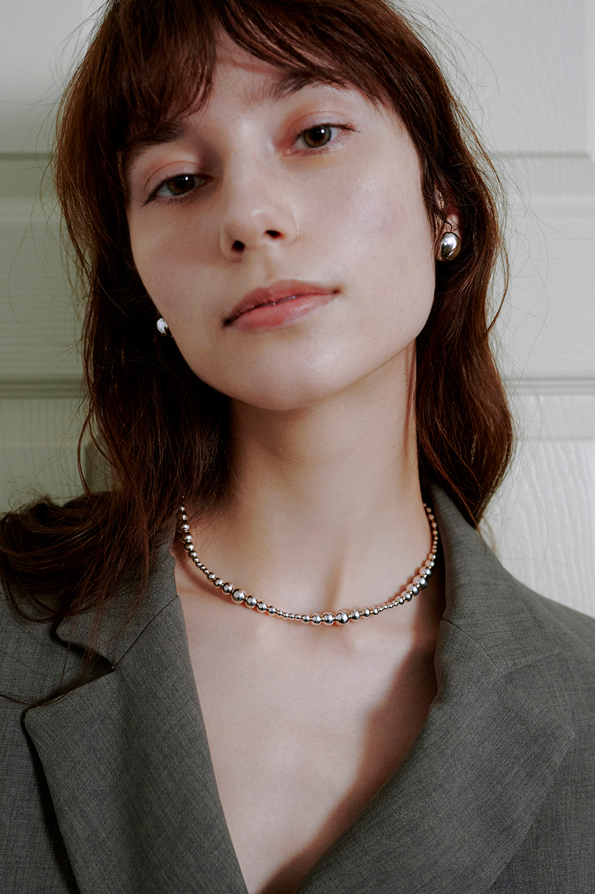 大小のシルバーボールをリズミカルに配置したネックレスはジャケットやクラシカルな洋服にラフさを。タイトなサイズ感なので大ぶりのピアスと合わせてもすっきり。