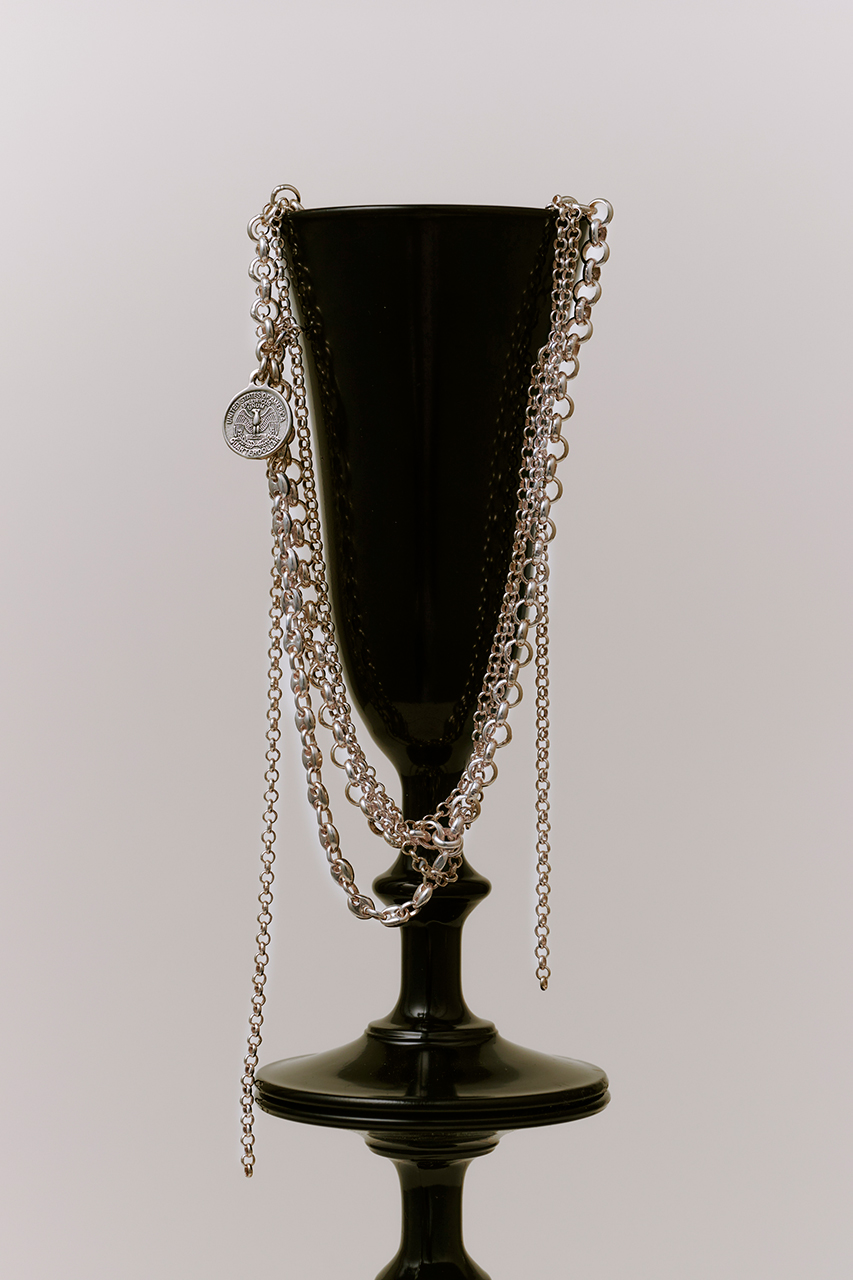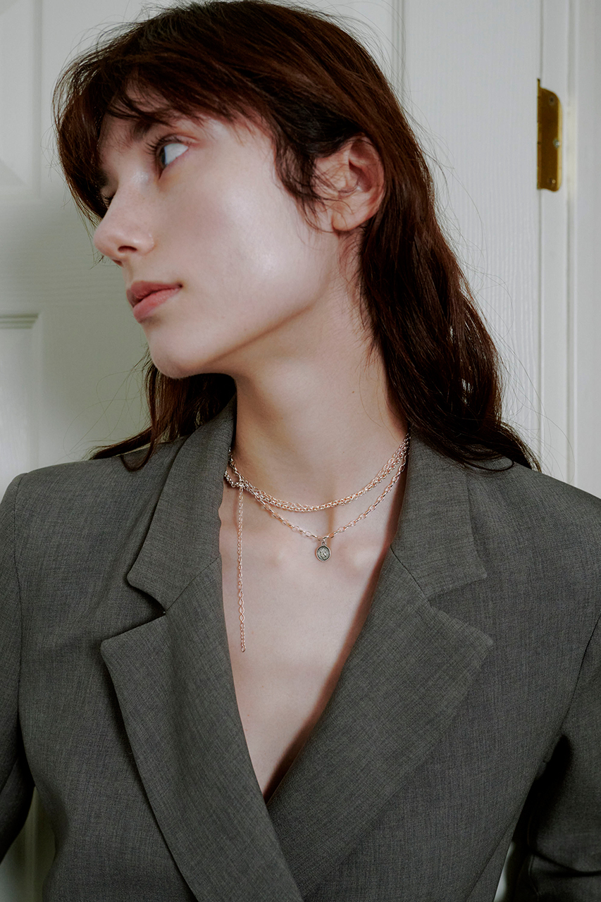 ジャケットスタイルをさらにモードさを足したいなら、コインモチーフをあしらった都会的なデザインのレイヤードネックレスを。