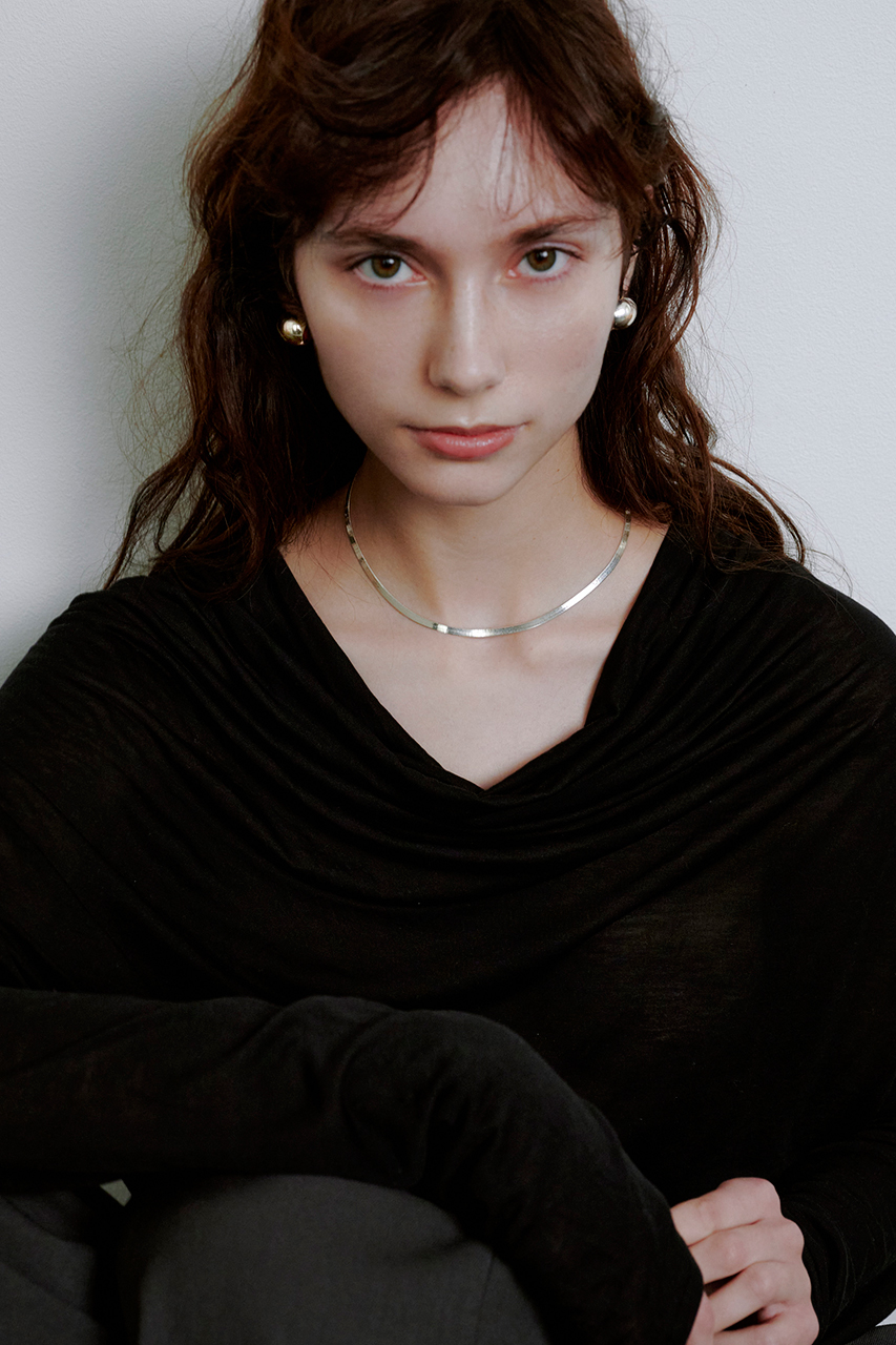 顔周りをさらに引き立ててくれるのは肌にぴったりと沿うスネークチェーンネックレス。