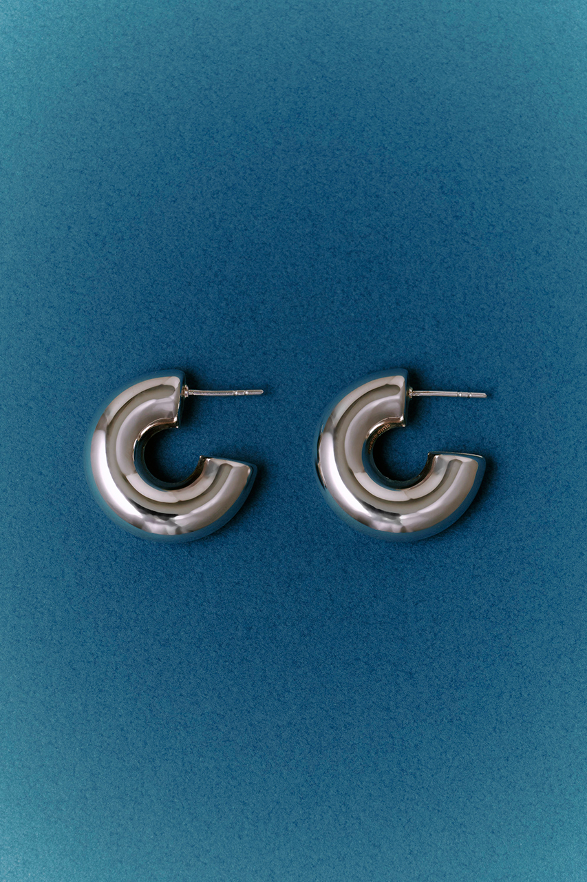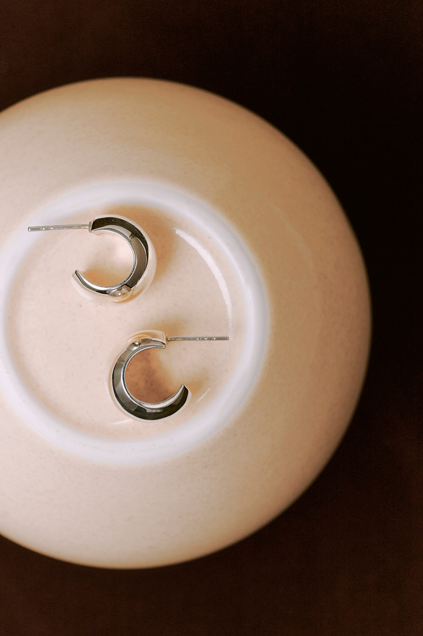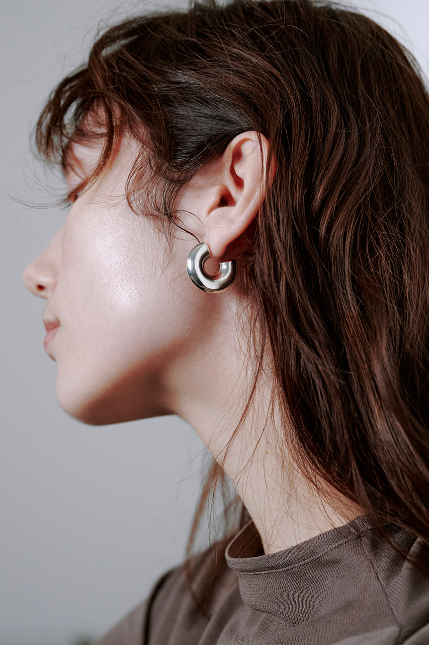 ぷっくりとしたフォルムのフープピアスと切り込みを加えた、彫刻的なデザインのフープピアス。