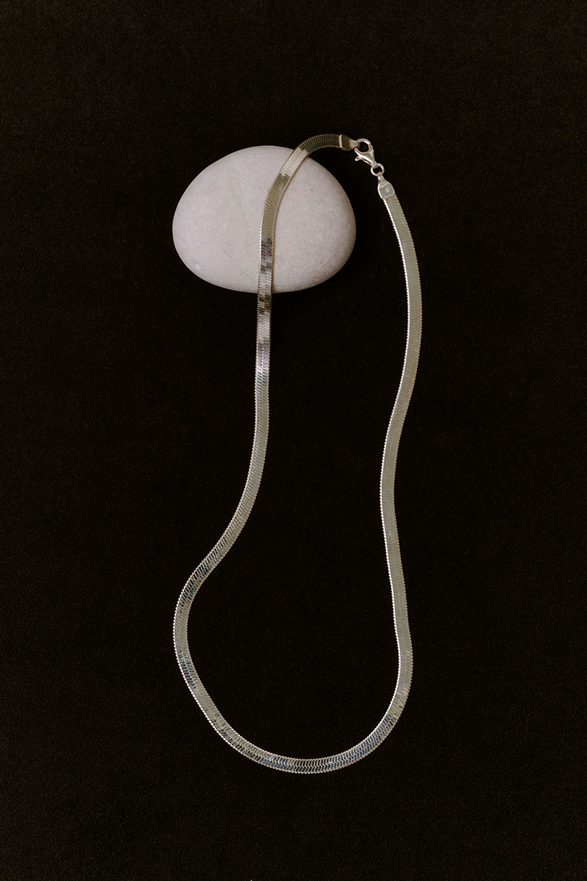 フラットなチェーンが肌に馴染み、凛とした輝きを放つシルバーの光沢が首元に輝きをプラスします。