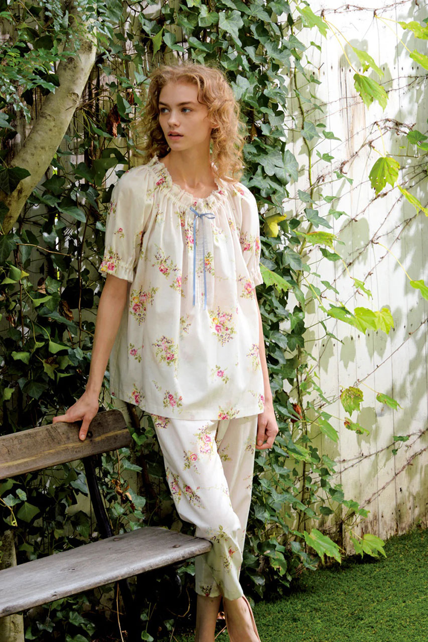 愛らしく控えめなコットンレースを施し、可憐なフラワープリントが引き立つシンプルなネグリジェ。