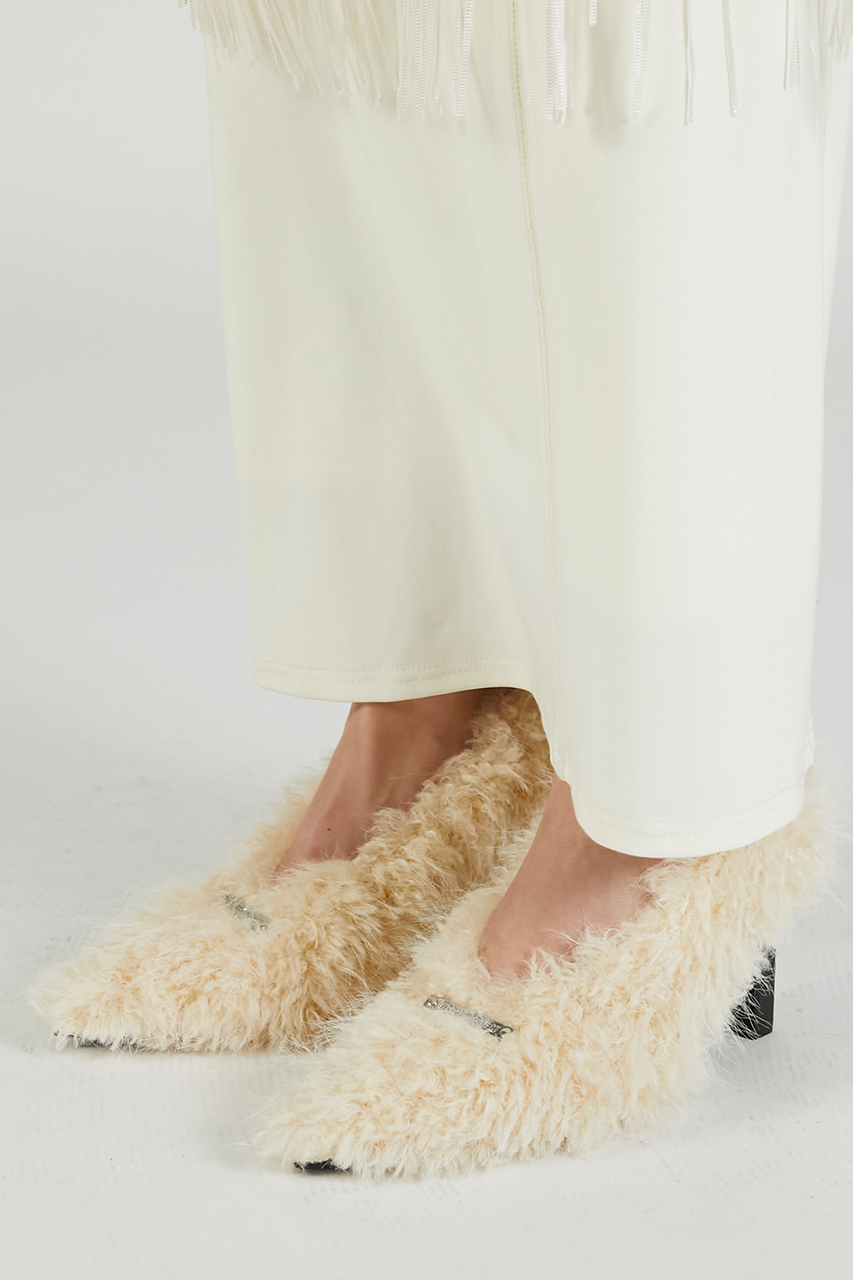 シャープなカットのポインテッドトゥと、フェイクファーのボリューム感が絶妙に調和した一足。グレーはプードルのようなカーリー感、アイボリーは長短のある毛足が高級感を演出します。厚手のパンツやスカートにも負けない存在感で、秋冬のスタイリングに華を添えます。