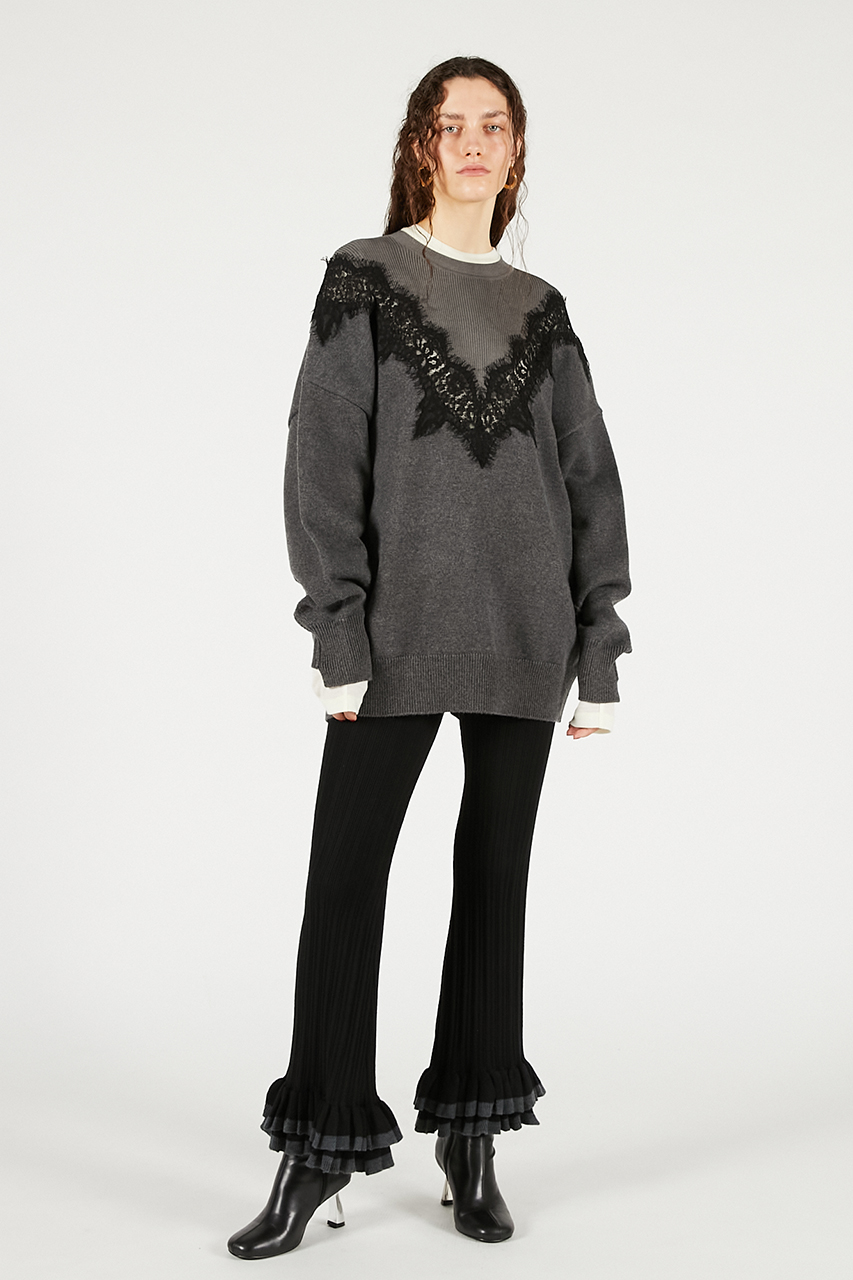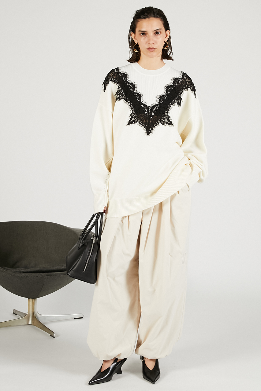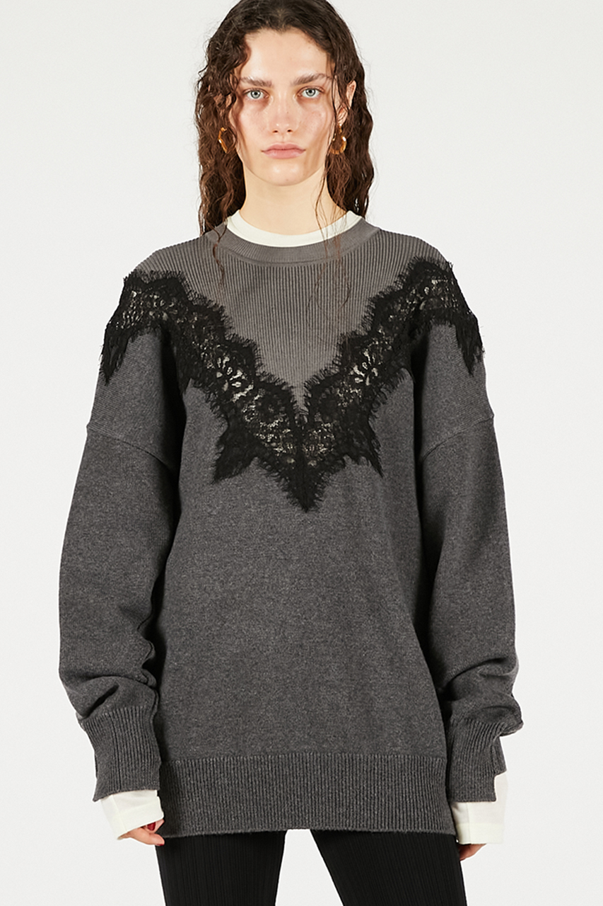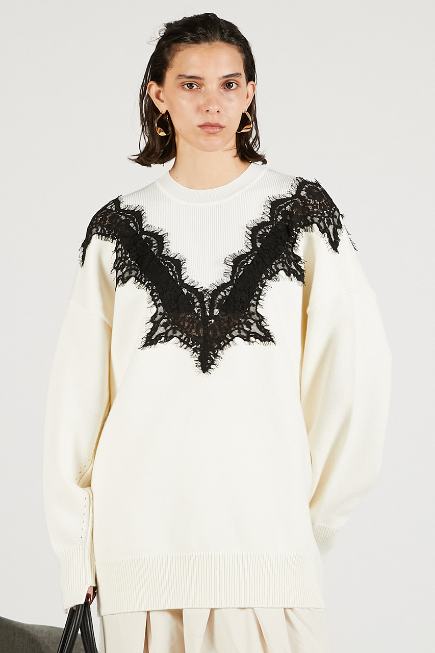 繊細なレースラインが印象的なオーバーサイズニット。レースの透け感が肌に溶け込むようにフェミニンさを醸し出しつつ、ボディはボリュームとラフさを取り入れてエッジの効いたシルエットに。カジュアルなボトムスに合わせても女性らしさがあり、スーチング系アイテムと合わせるとこなれ感のある印象に。