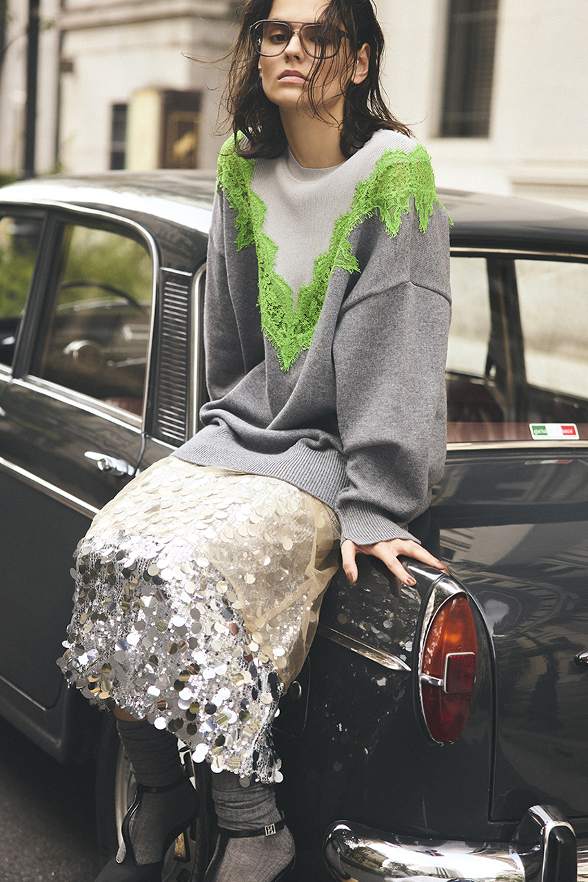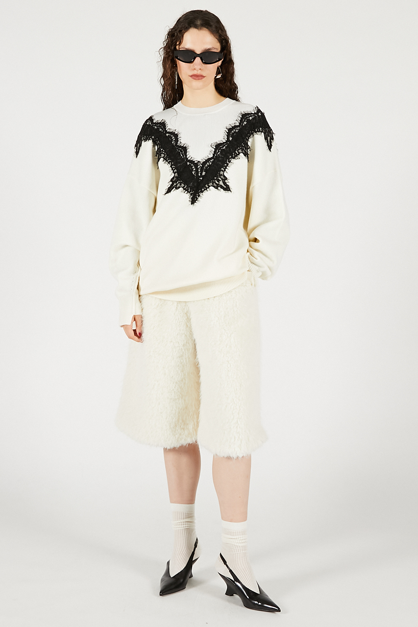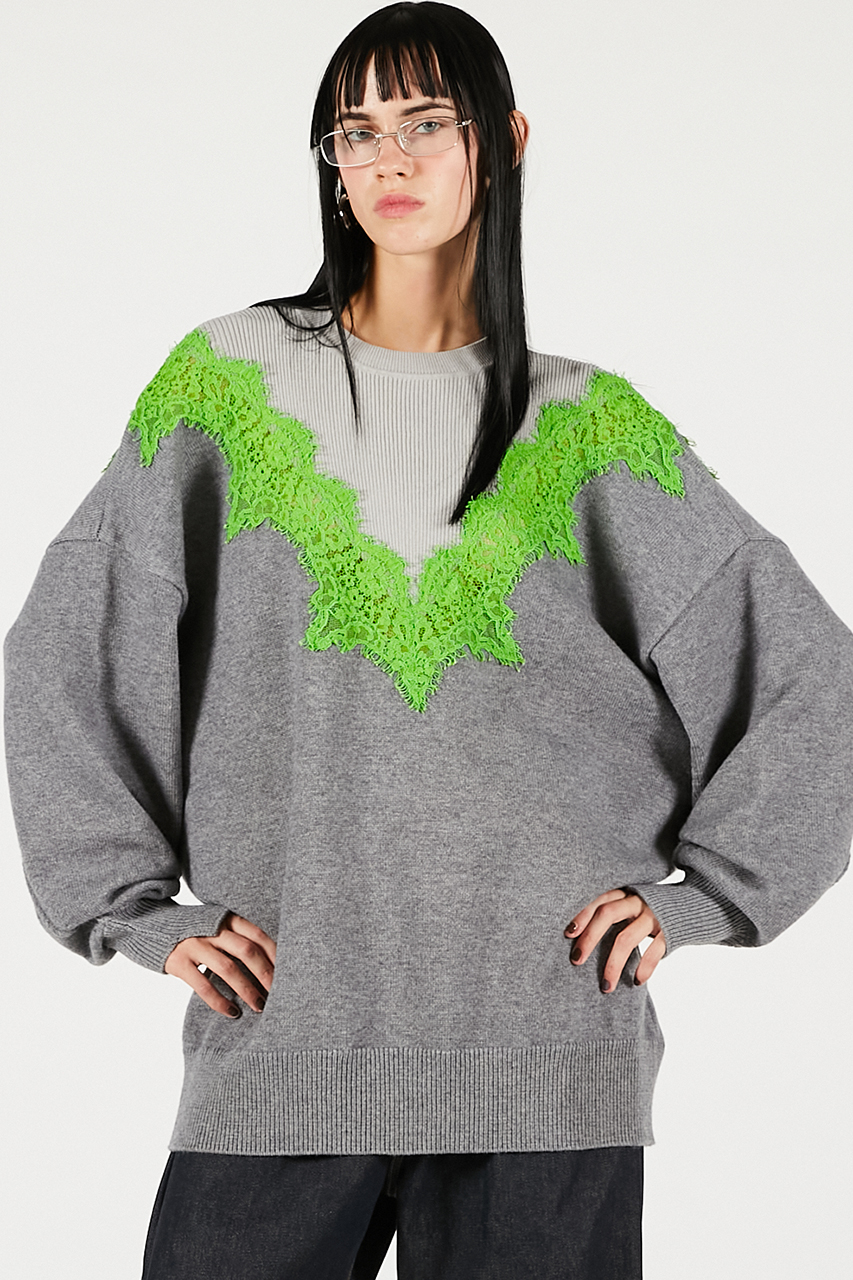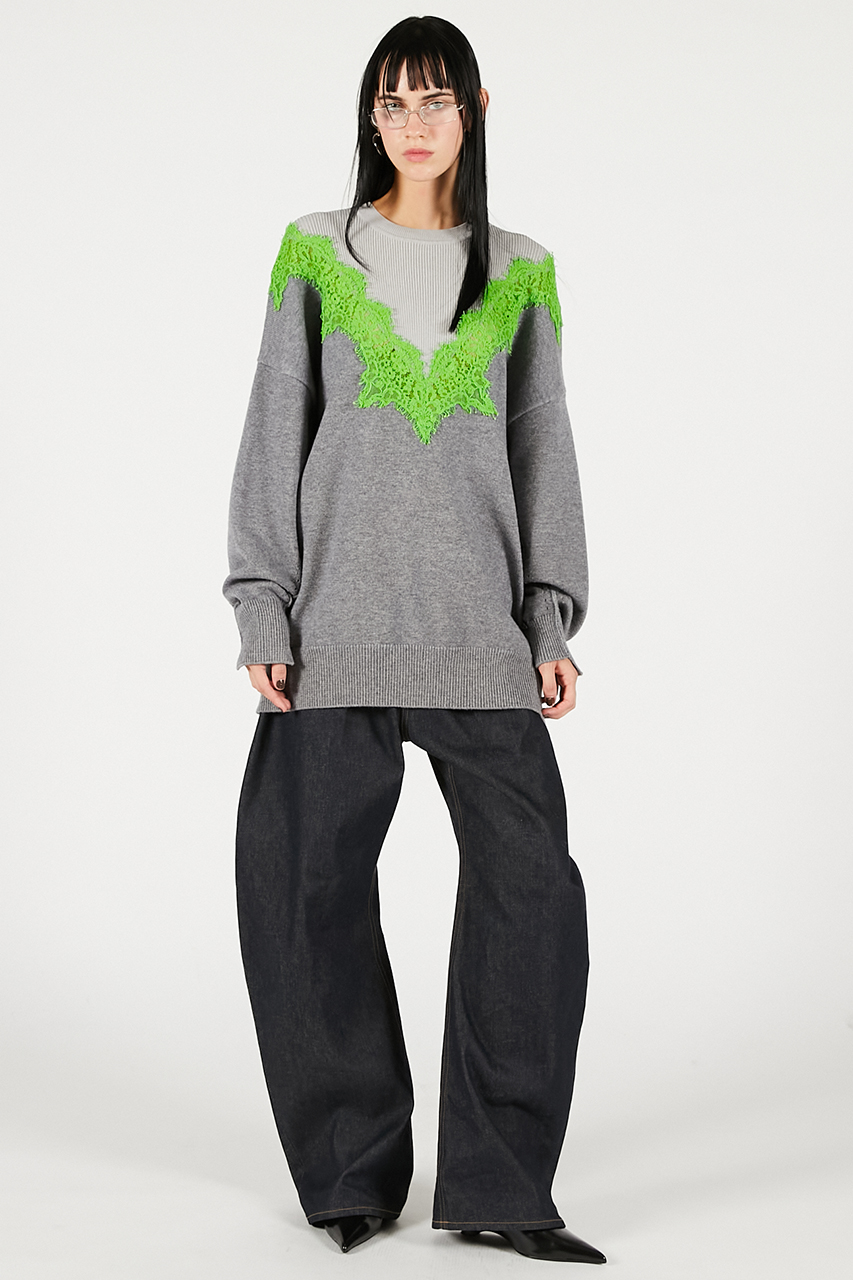 繊細なレースラインが印象的なオーバーサイズニット。レースの透け感が肌に溶け込むようにフェミニンさを醸し出しつつ、ボディはボリュームとラフさを取り入れてエッジの効いたシルエットに。カジュアルなボトムスに合わせても女性らしさがあり、スーチング系アイテムと合わせるとこなれ感のある印象に。