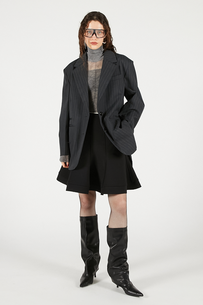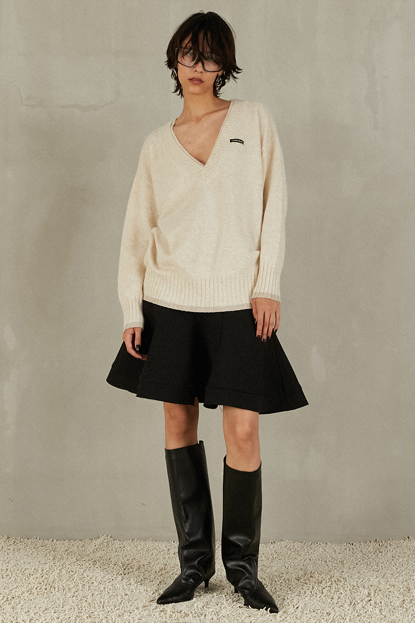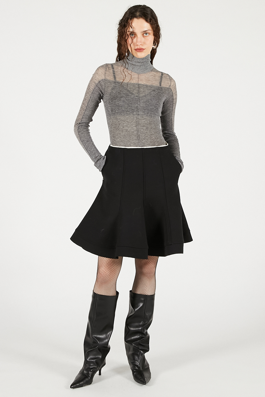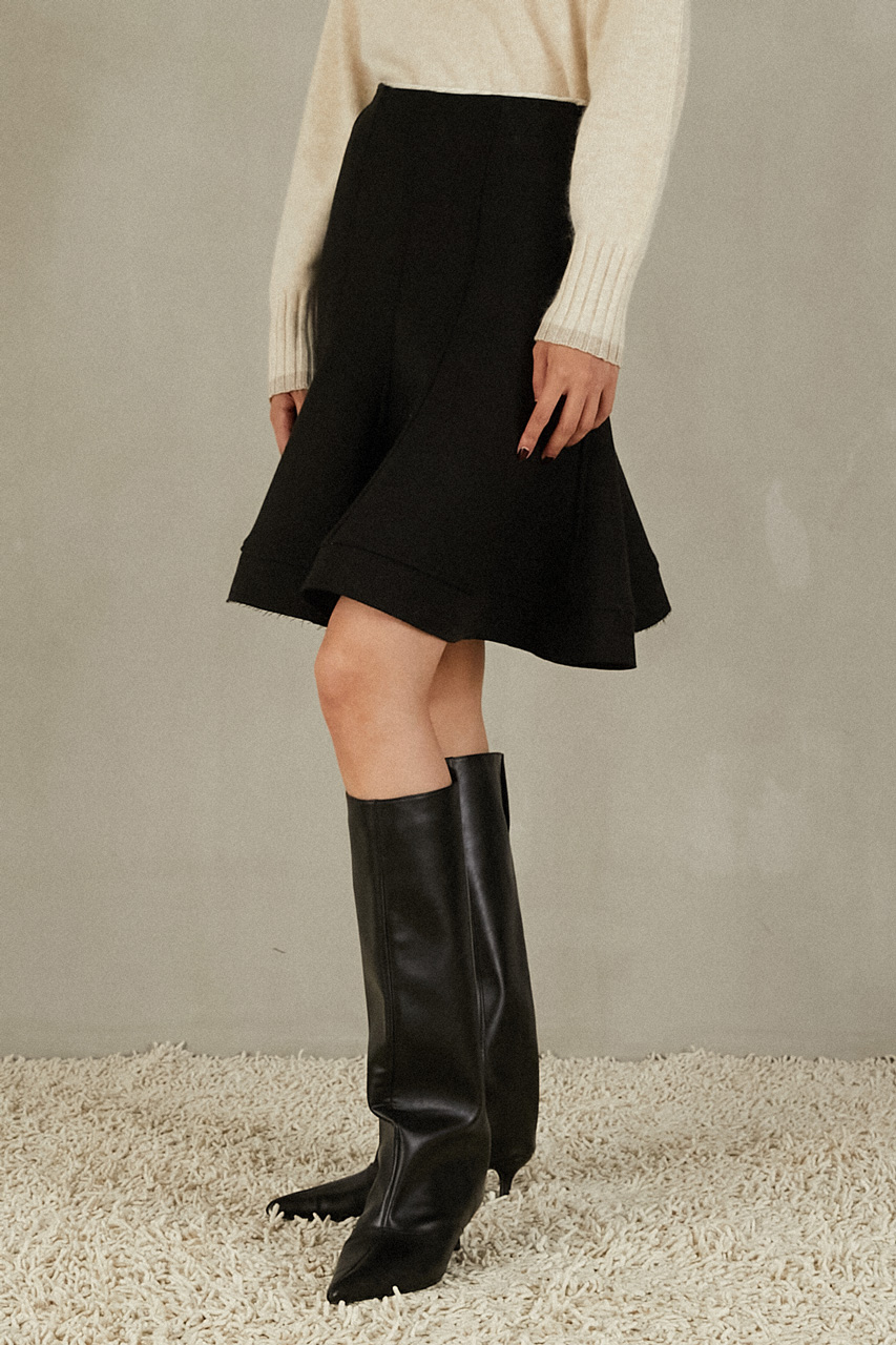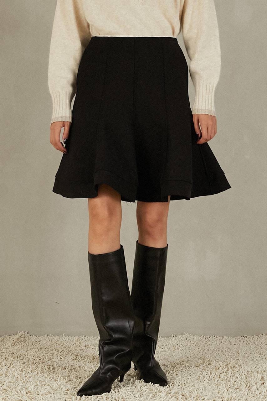 歩くたびに揺れる優雅なフレアシルエットを追求した一枚。裏地に芯地を張った構築的なフォルムが、フォーマルでもカジュアルでも品格を保ちつつ、存在感を放ちます。甘さを抑えつつ、印象的なラインで冬の装いを格上げするスカートです。