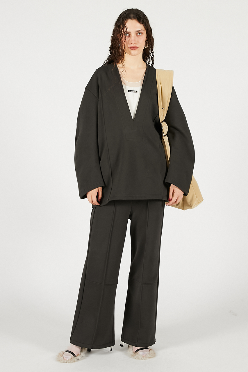ゆったりとしたシルエットながらも、裾のドロストデザインでメリハリを出せるので、ブーツやスニーカーとのスタイリングも自在。リラックス感と洗練された印象を両立させました。セットアップも展開しています。