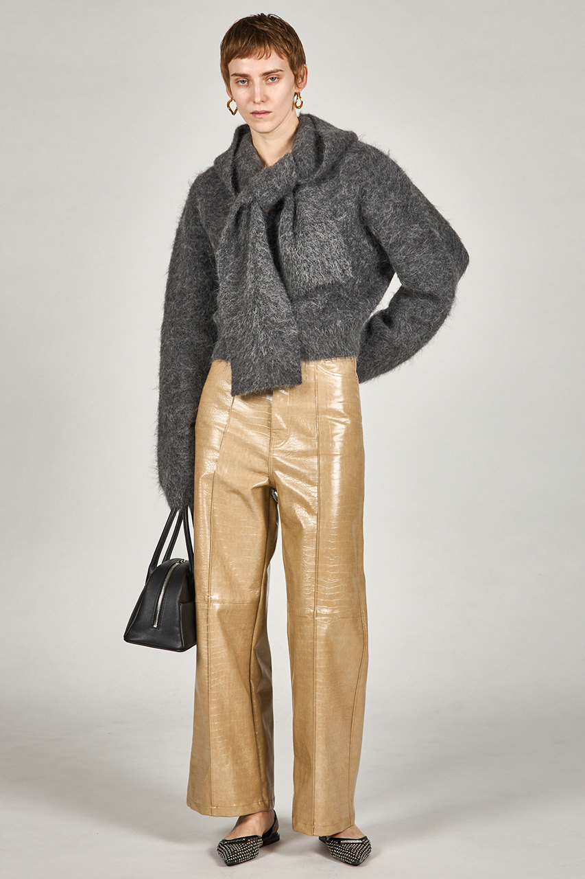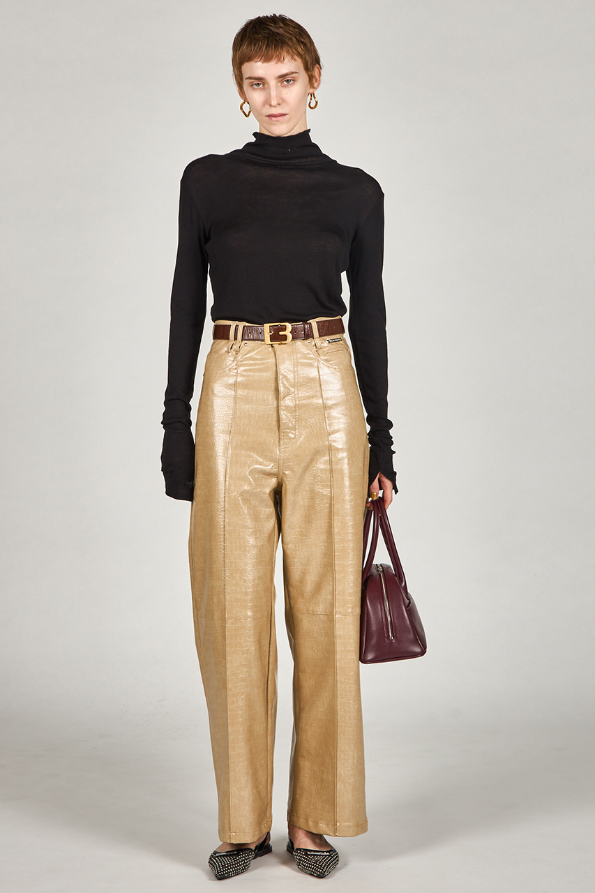 冬のスタイリングに洗練されたアクセントを加える、合皮のプレスパンツ。フロントに施された折り目が縦のラインを強調し、ストレートワイドシルエットが脚長効果を発揮します。ウエスト位置は程よくマークされ、ゆったりとしたトップスともバランスよく着こなせるデザインです。