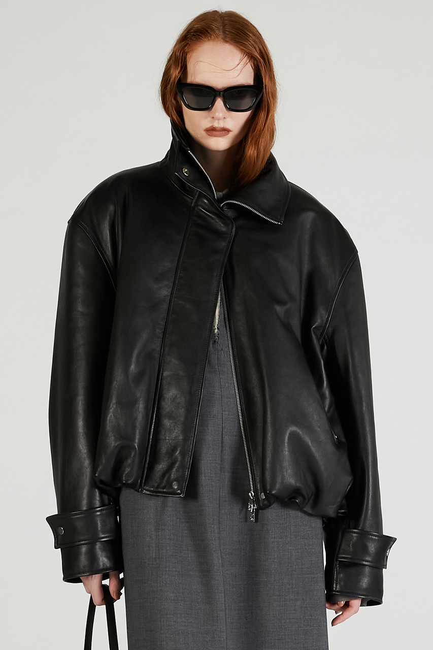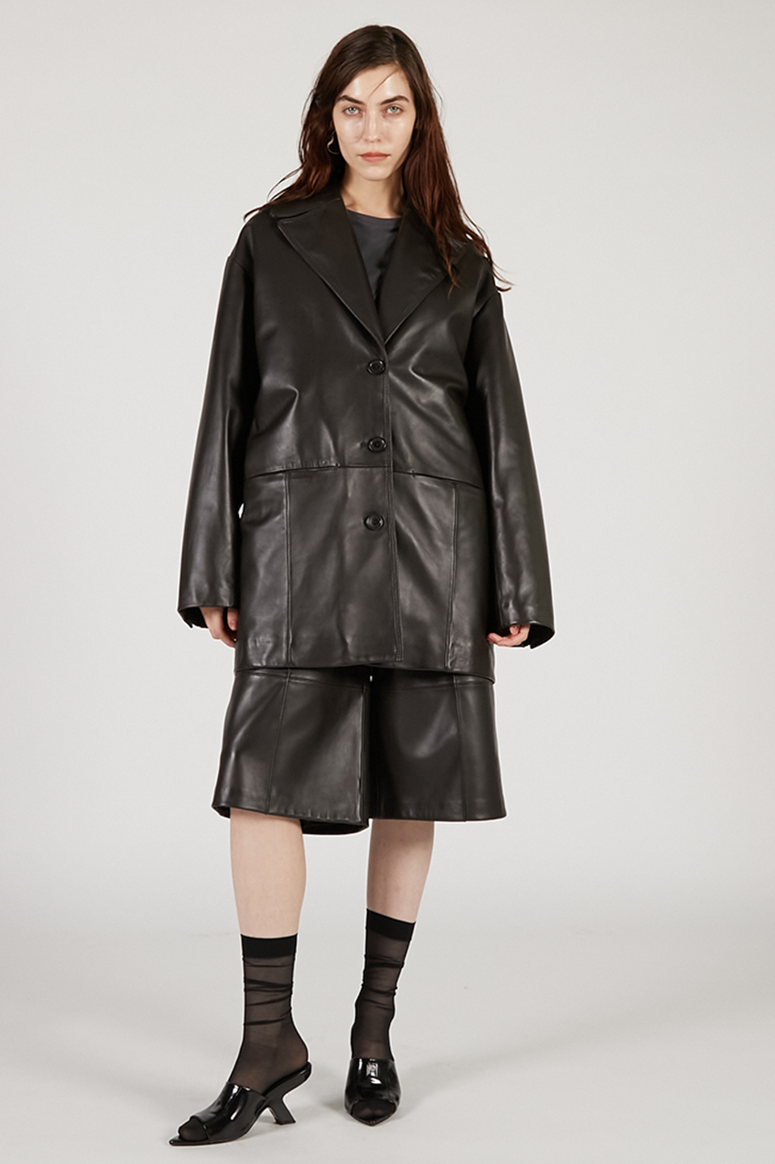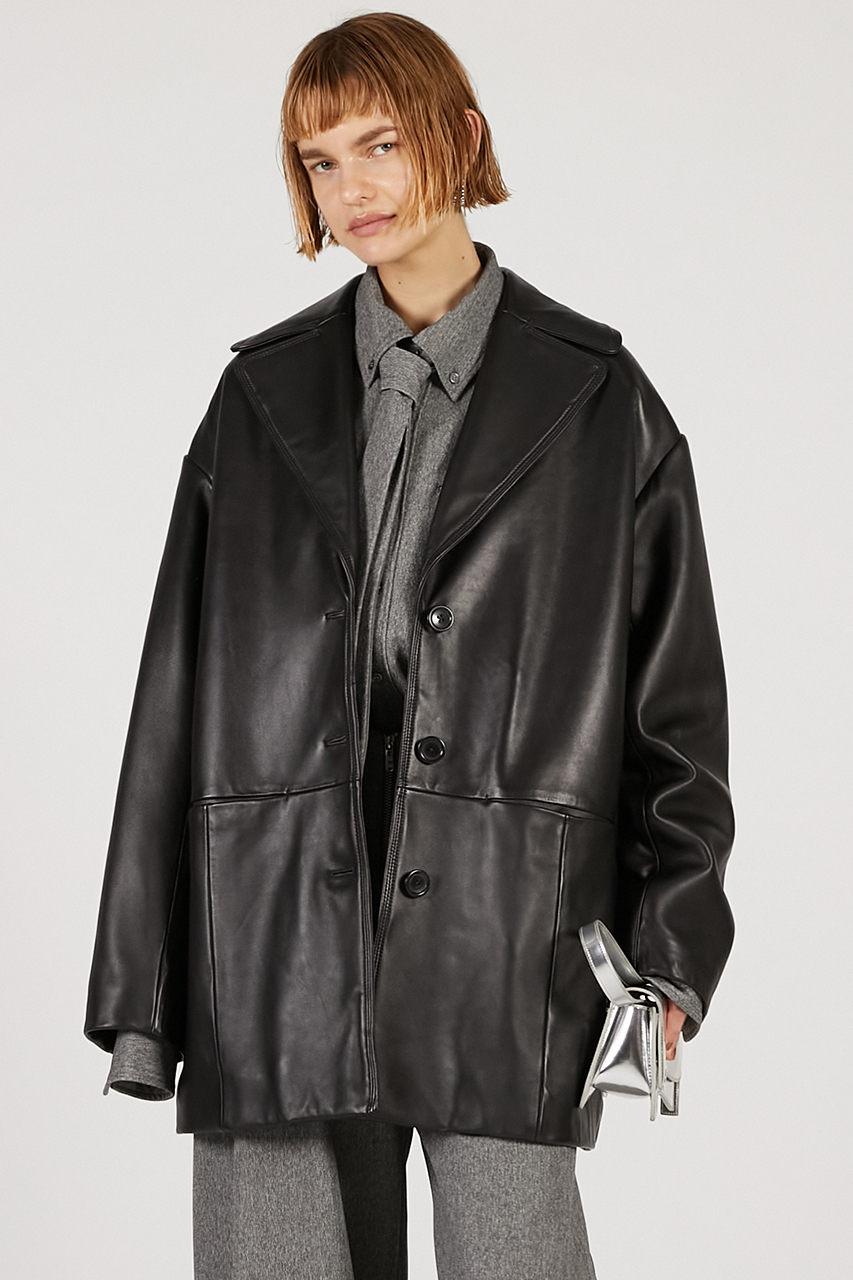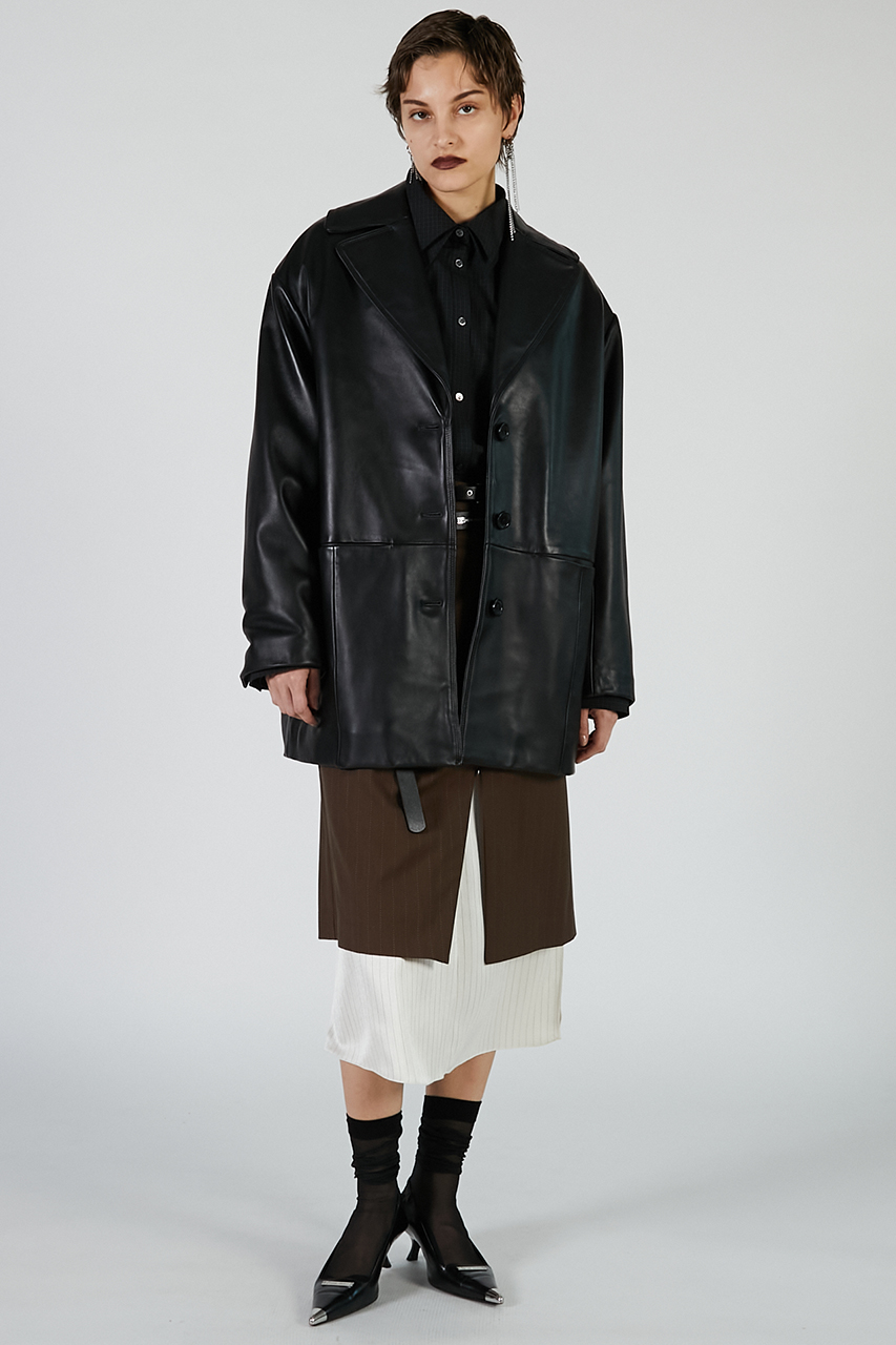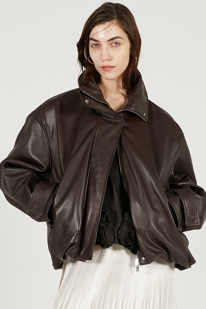 存在感のあるビッグカラーとラグジュアリーなシープレザーが際立つジャケットコート。丸みを帯びたショルダーラインとややオーバーサイズなシルエットが、着るだけで計算された抜け感と余裕を演出します。ミニマルなディテールでまとめられているからこそ、素材とフォルムが主役に。