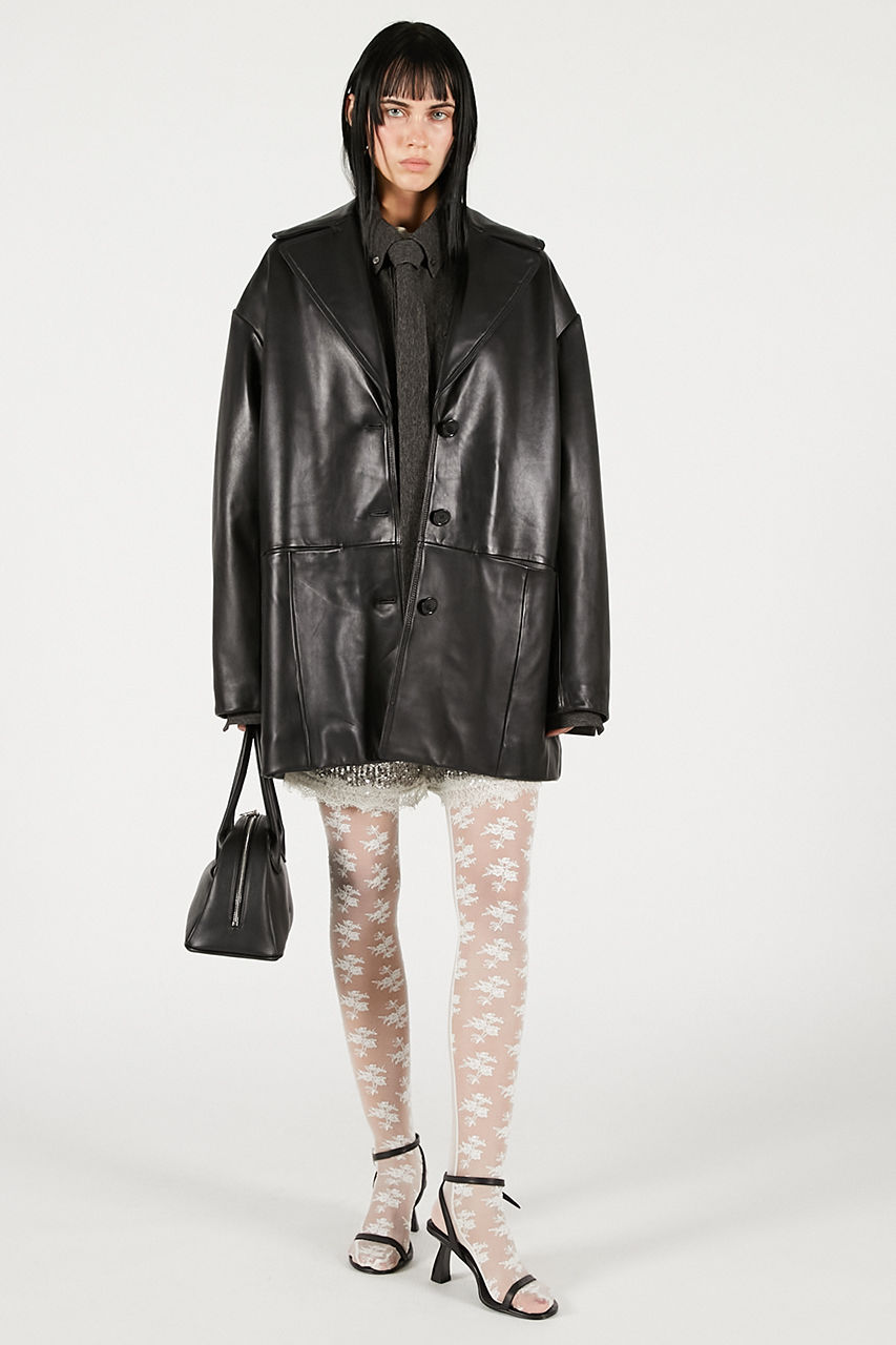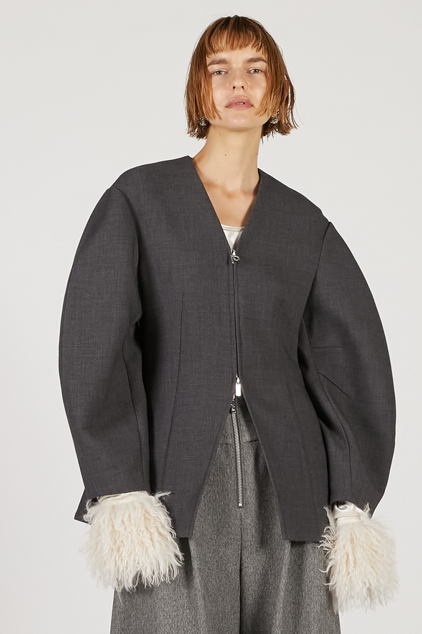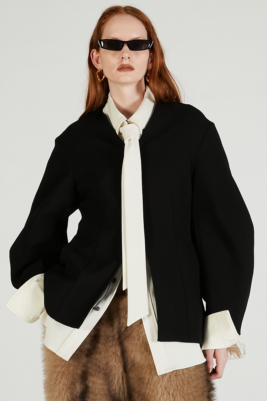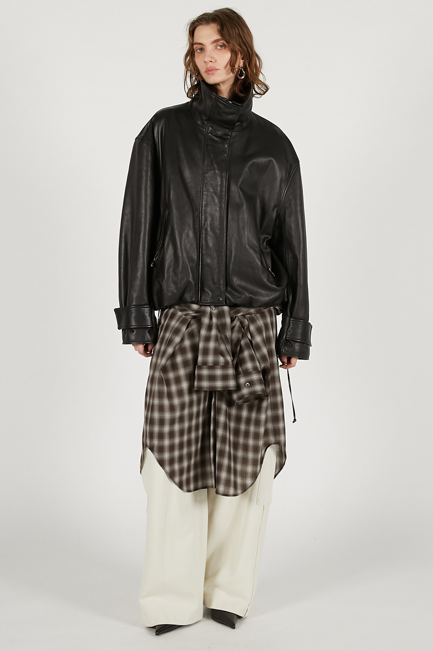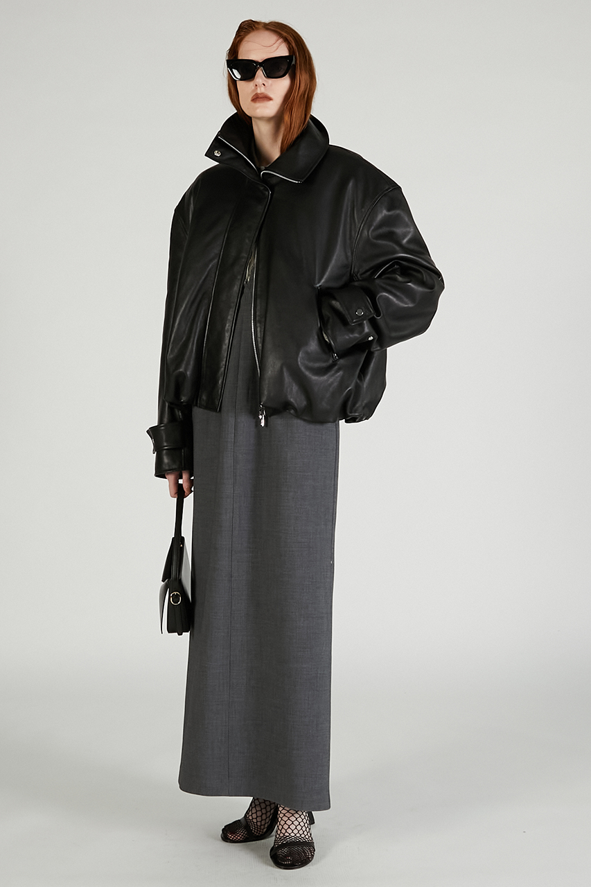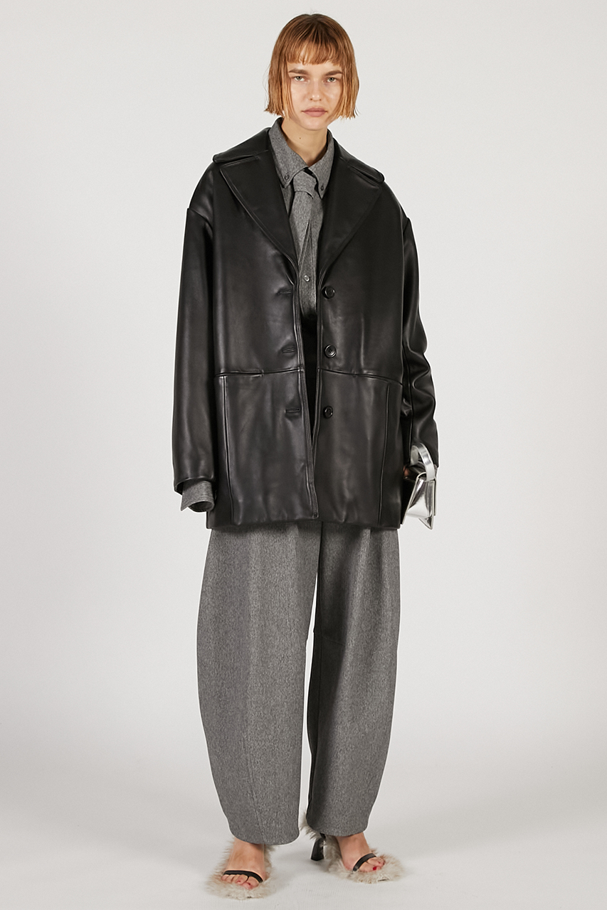 存在感のあるビッグカラーとラグジュアリーなシープレザーが際立つジャケットコート。丸みを帯びたショルダーラインとややオーバーサイズなシルエットが、着るだけで計算された抜け感と余裕を演出します。ミニマルなディテールでまとめられているからこそ、素材とフォルムが主役に。
