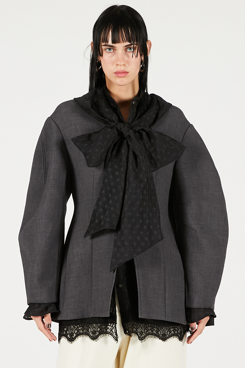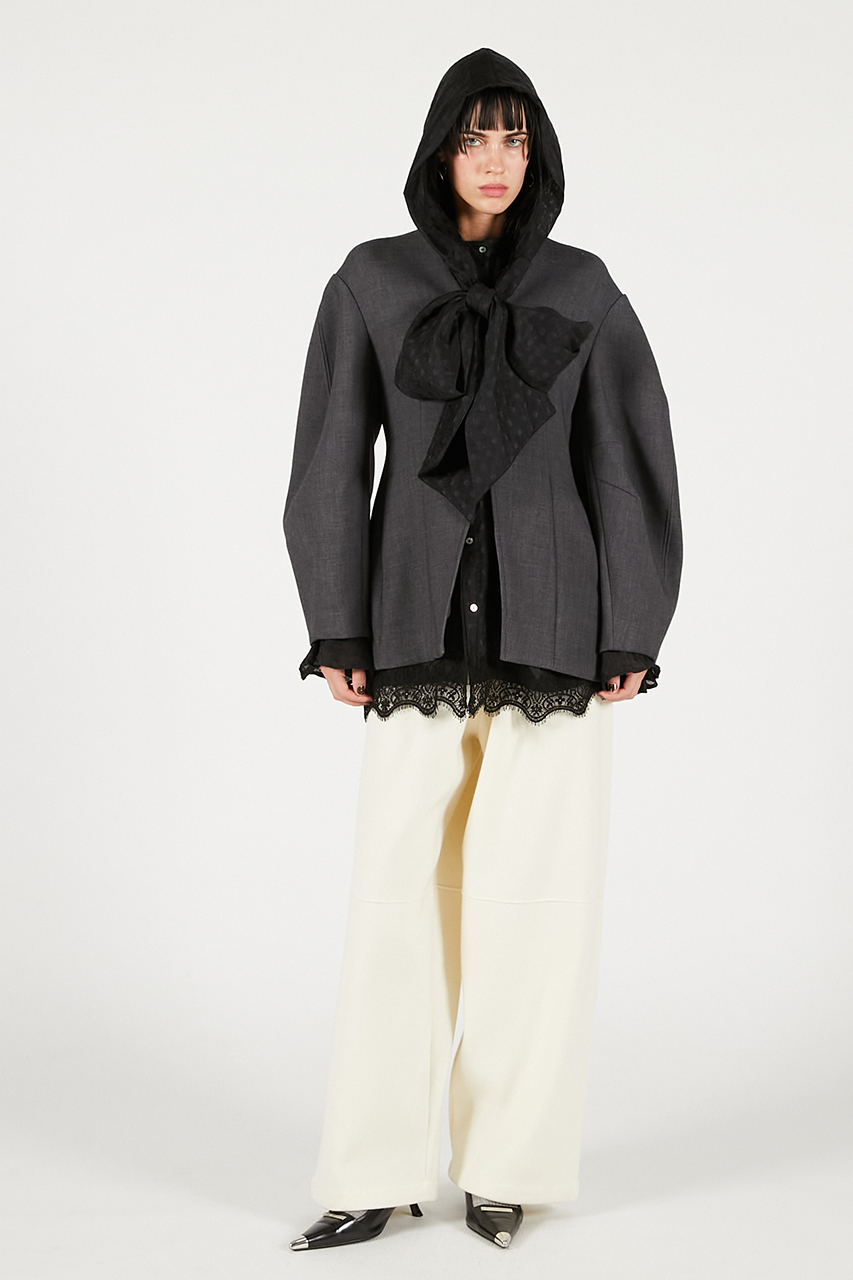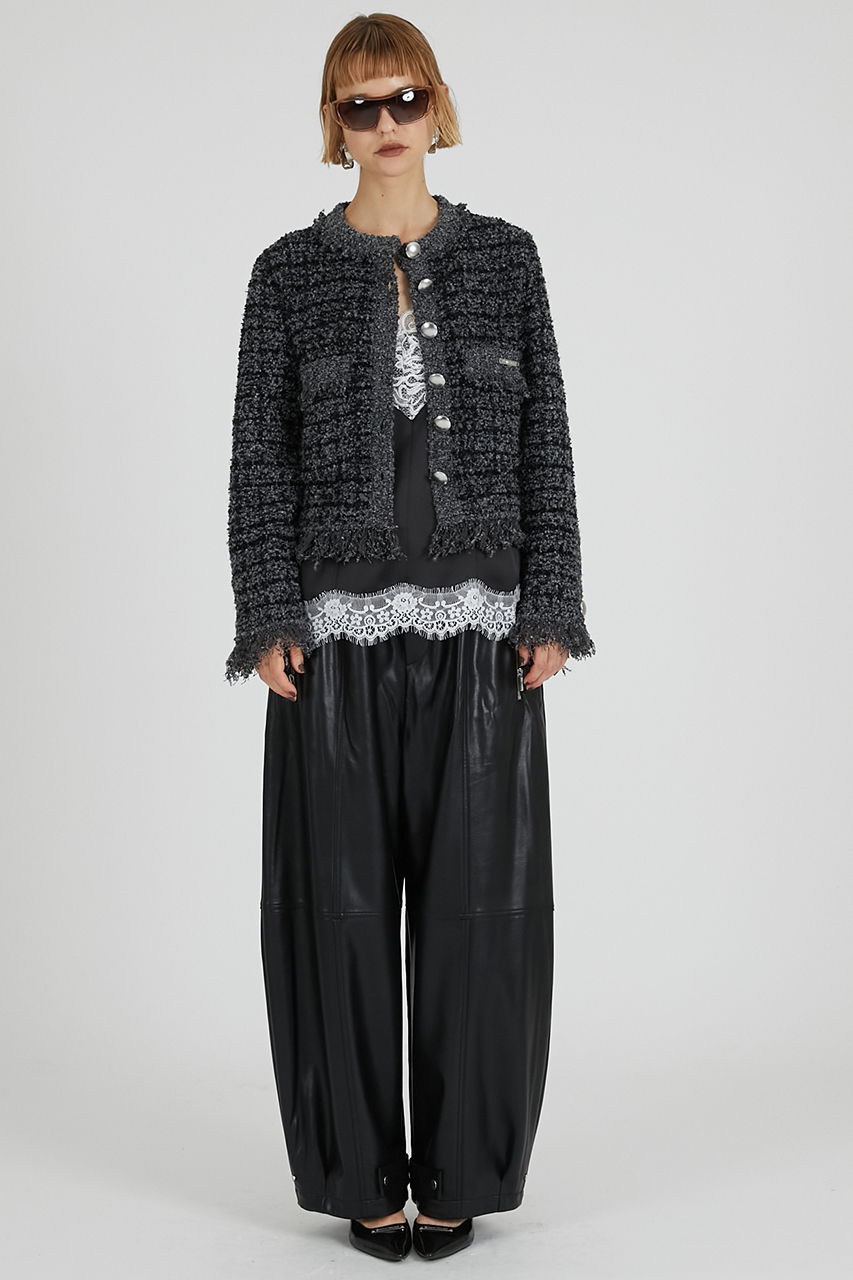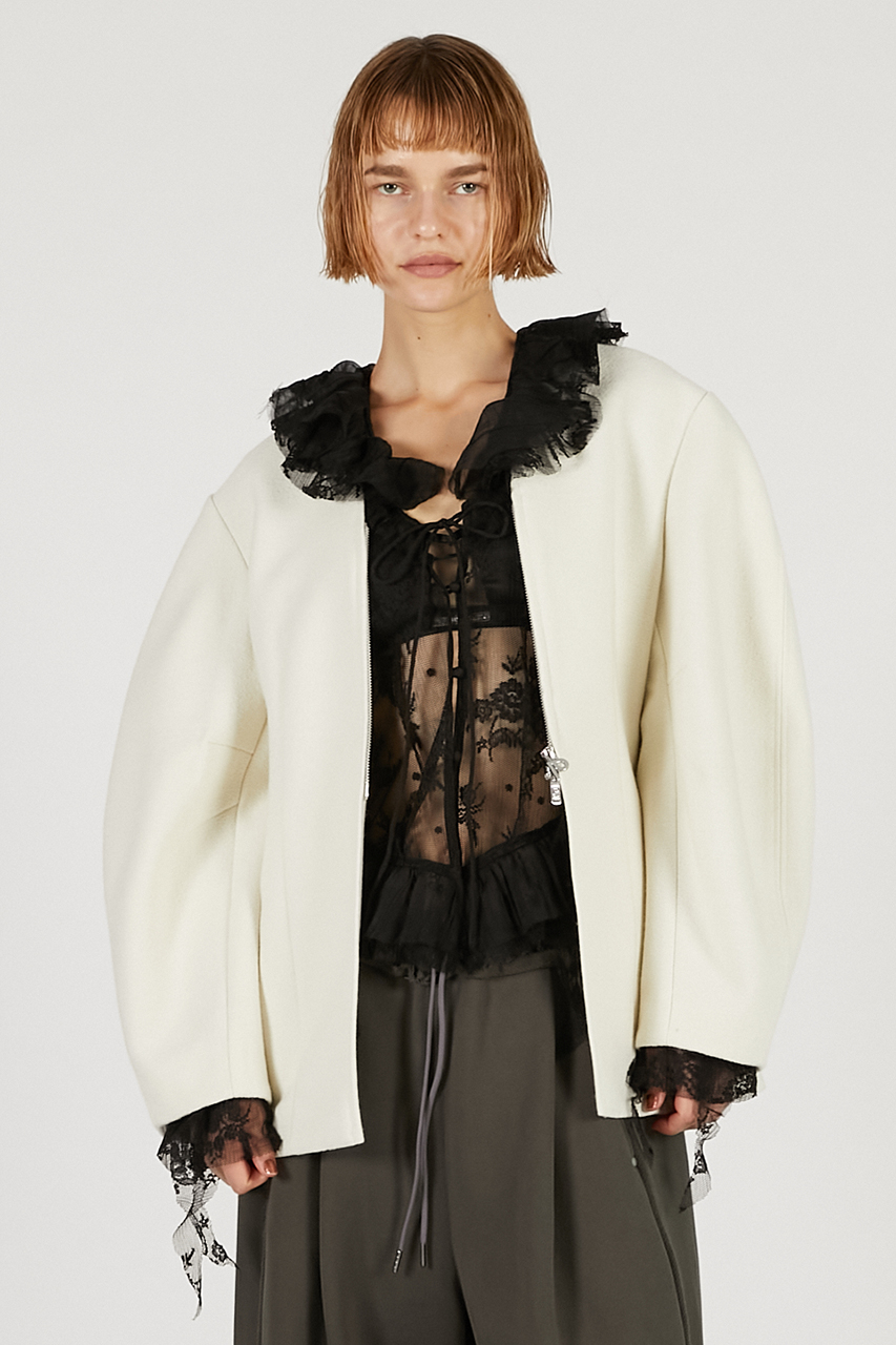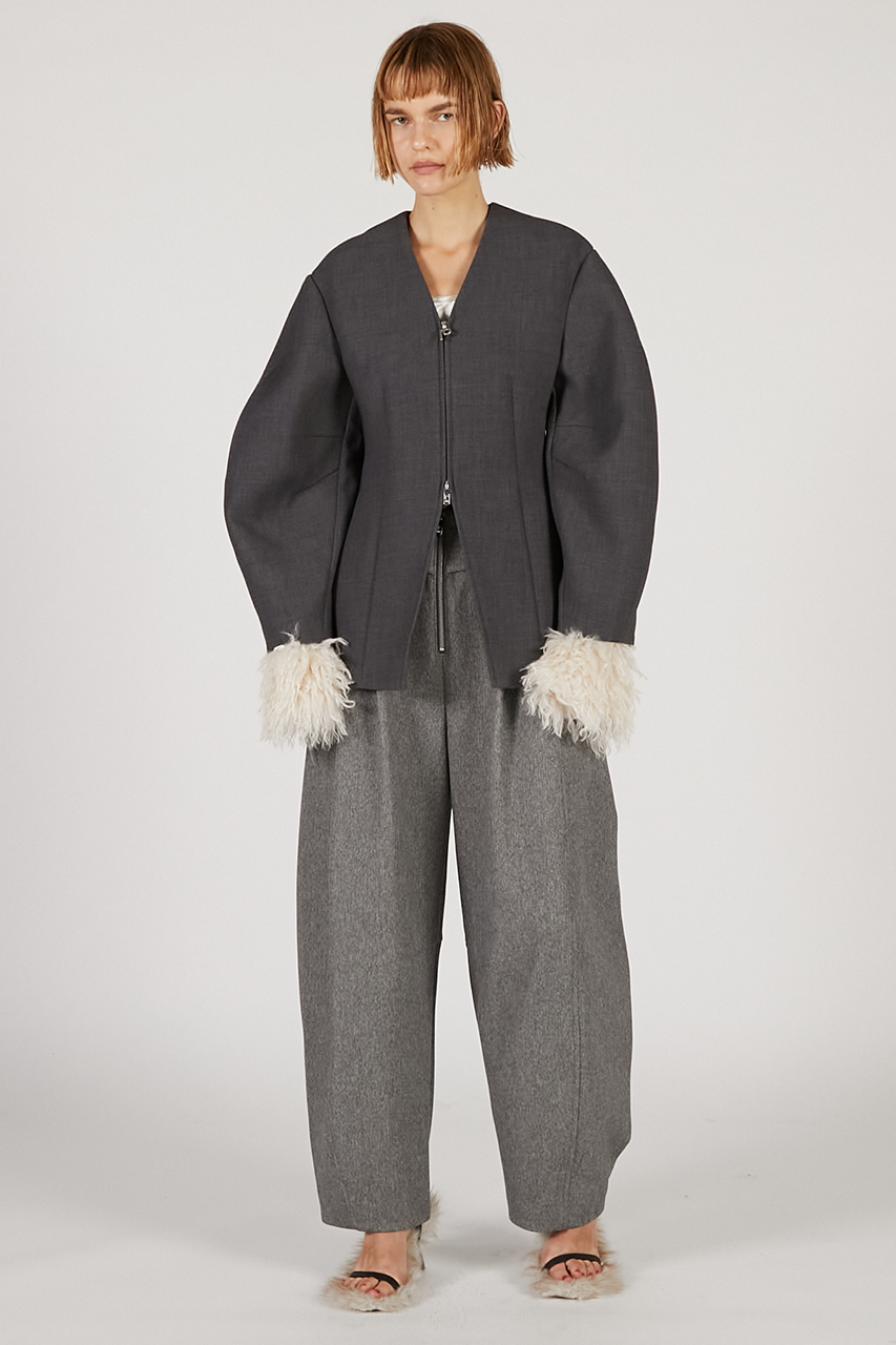 存在感のあるビッグカラーとラグジュアリーなシープレザーが際立つジャケットコート。丸みを帯びたショルダーラインとややオーバーサイズなシルエットが、着るだけで計算された抜け感と余裕を演出します。ミニマルなディテールでまとめられているからこそ、素材とフォルムが主役に。