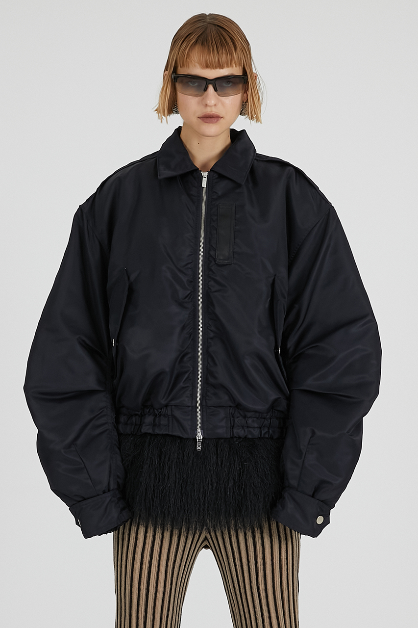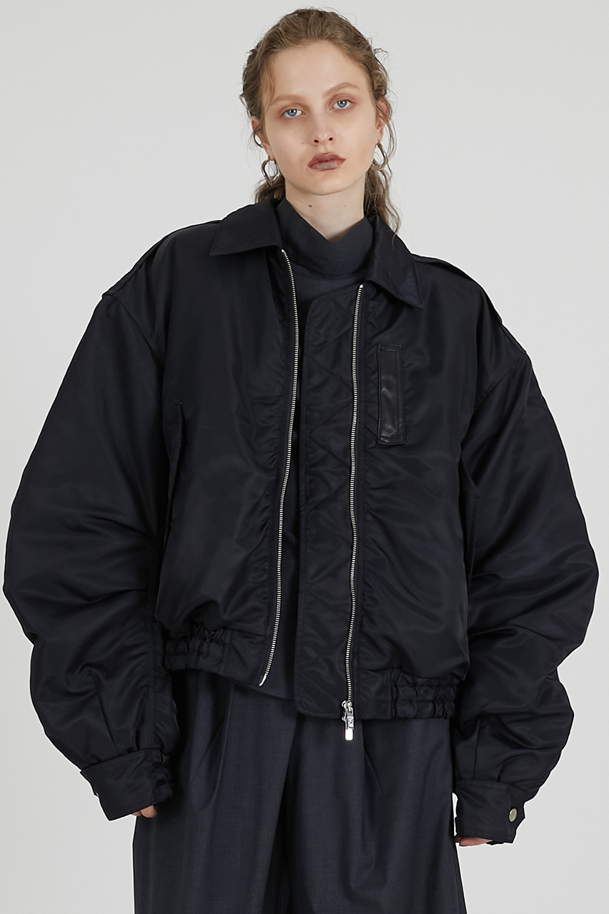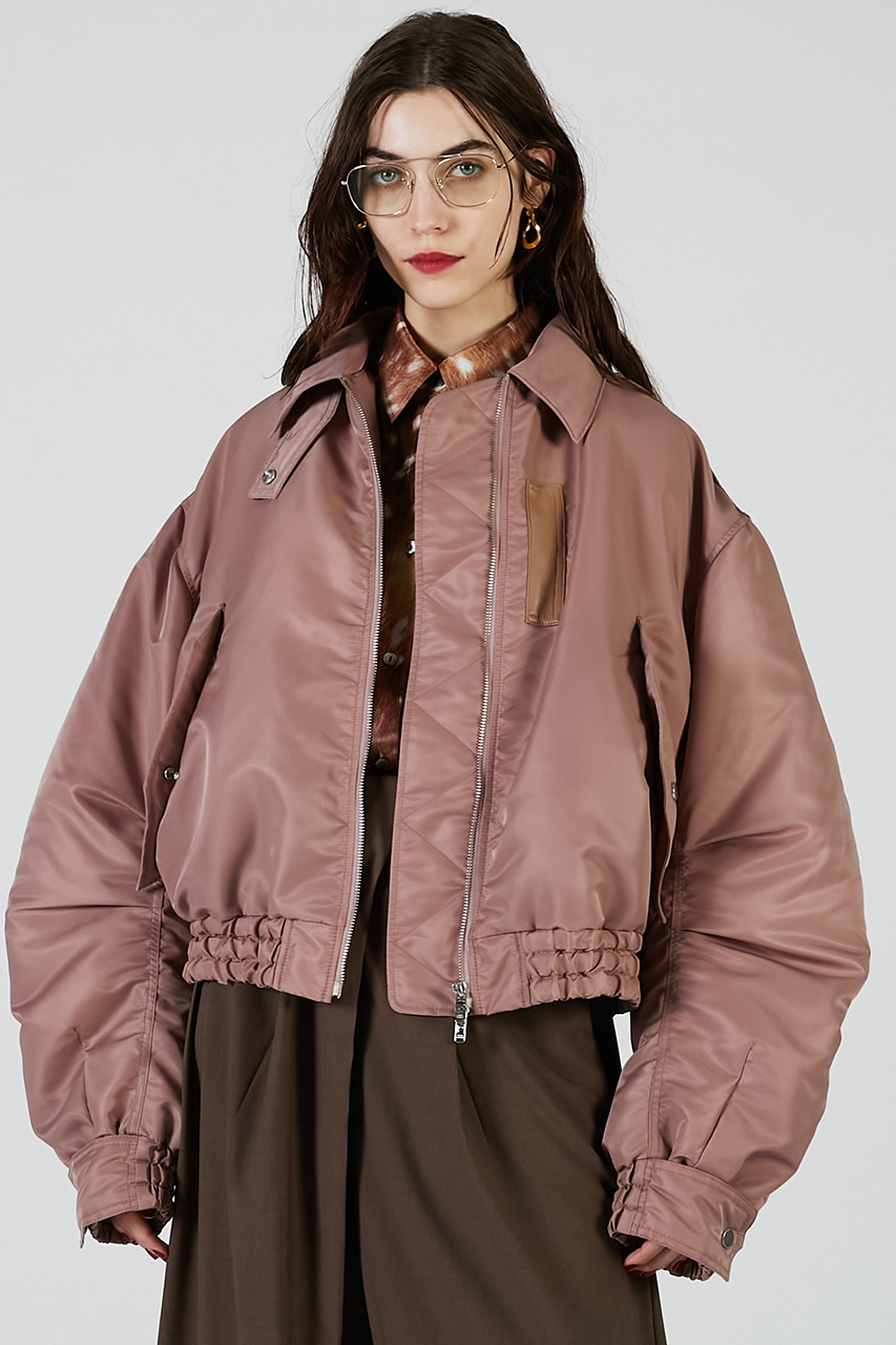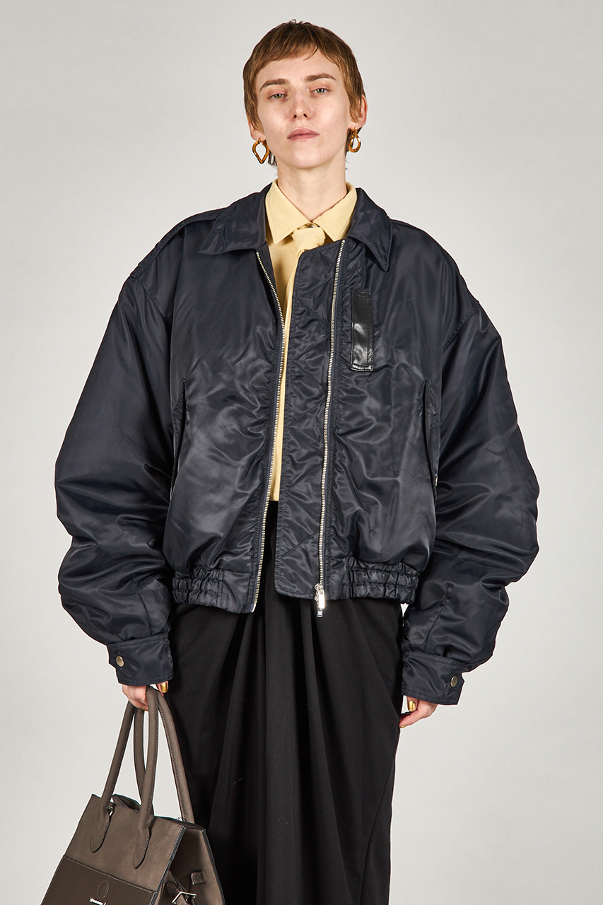 クラシックなフライトジャケットをモダンに再構築した一着。パワーショルダーと太めの袖が特徴的で、シルエットに力強さと女性らしさを同時に演出します。中綿入りで秋から冬にかけての軽アウターとしても活躍し、取り外し可能なショルダーパッド付きで、シルエットの調整も自由自在です。