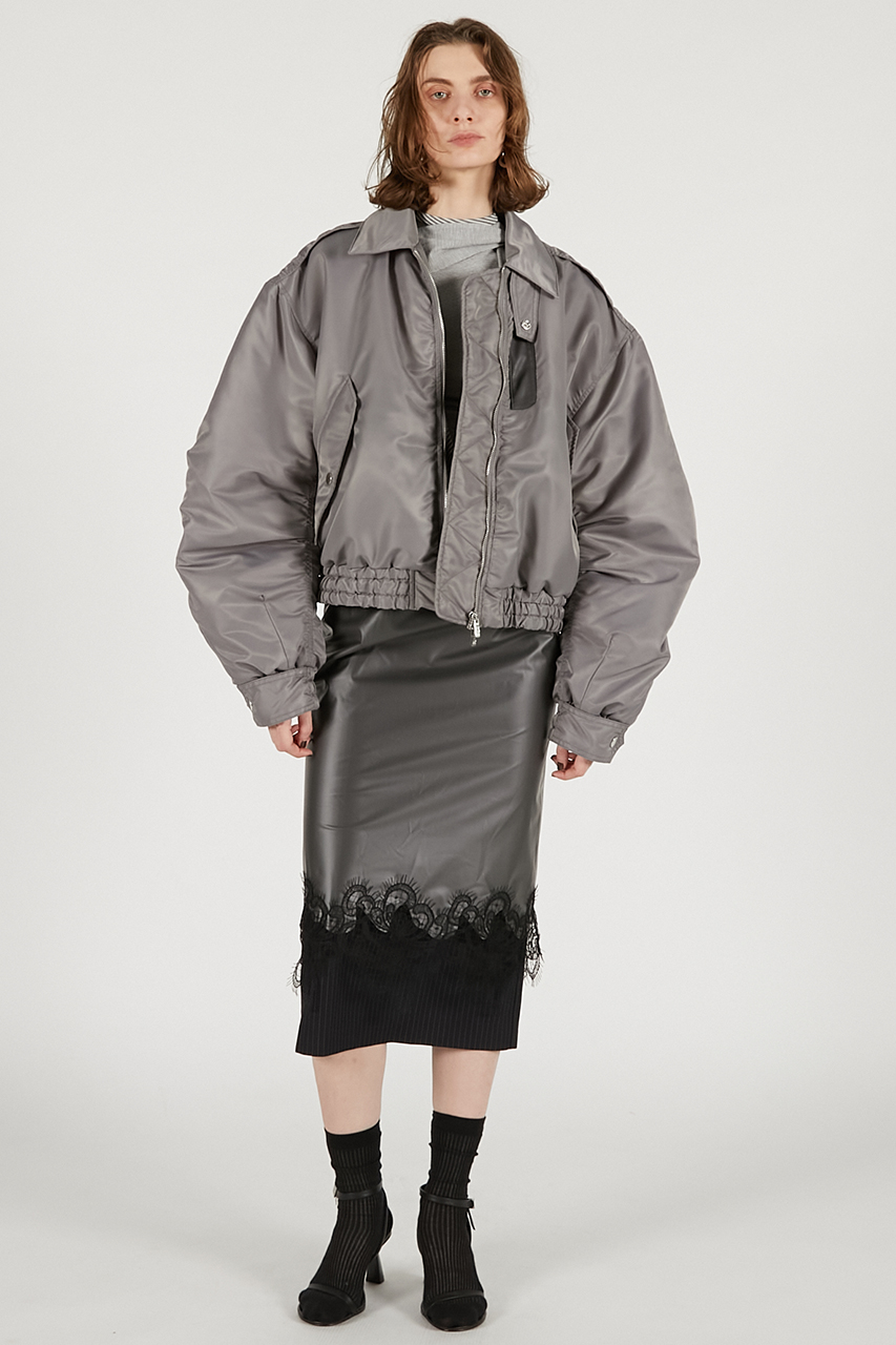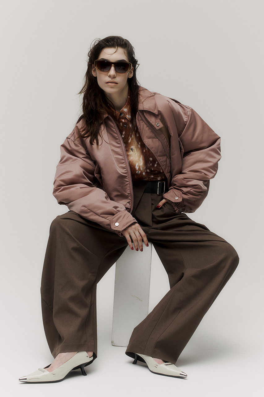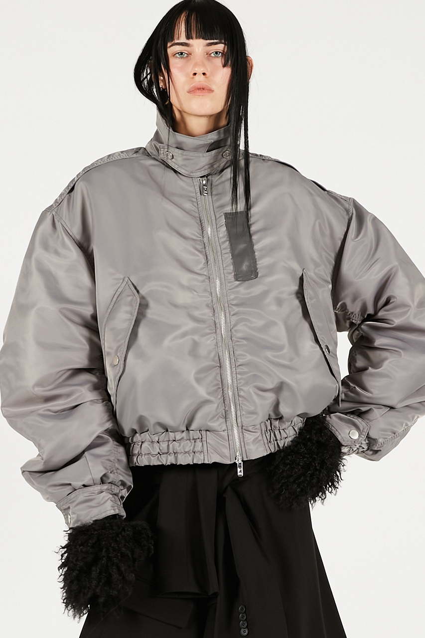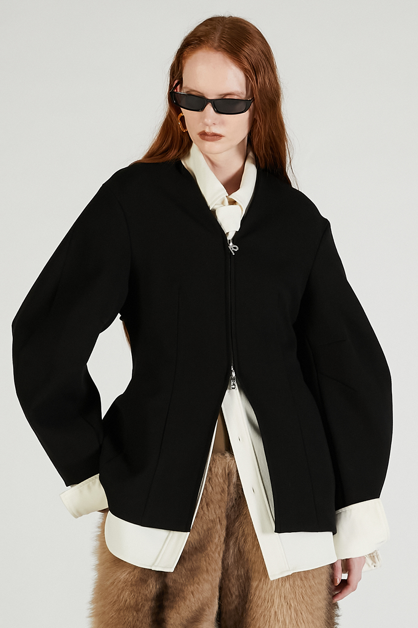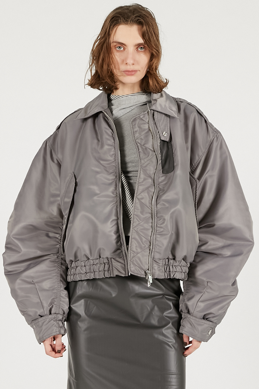 クラシックなフライトジャケットをモダンに再構築した一着。パワーショルダーと太めの袖が特徴的で、シルエットに力強さと女性らしさを同時に演出します。中綿入りで秋から冬にかけての軽アウターとしても活躍し、取り外し可能なショルダーパッド付きで、シルエットの調整も自由自在です。