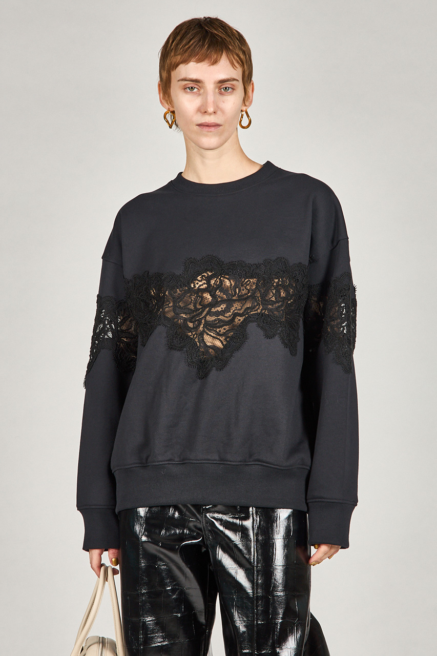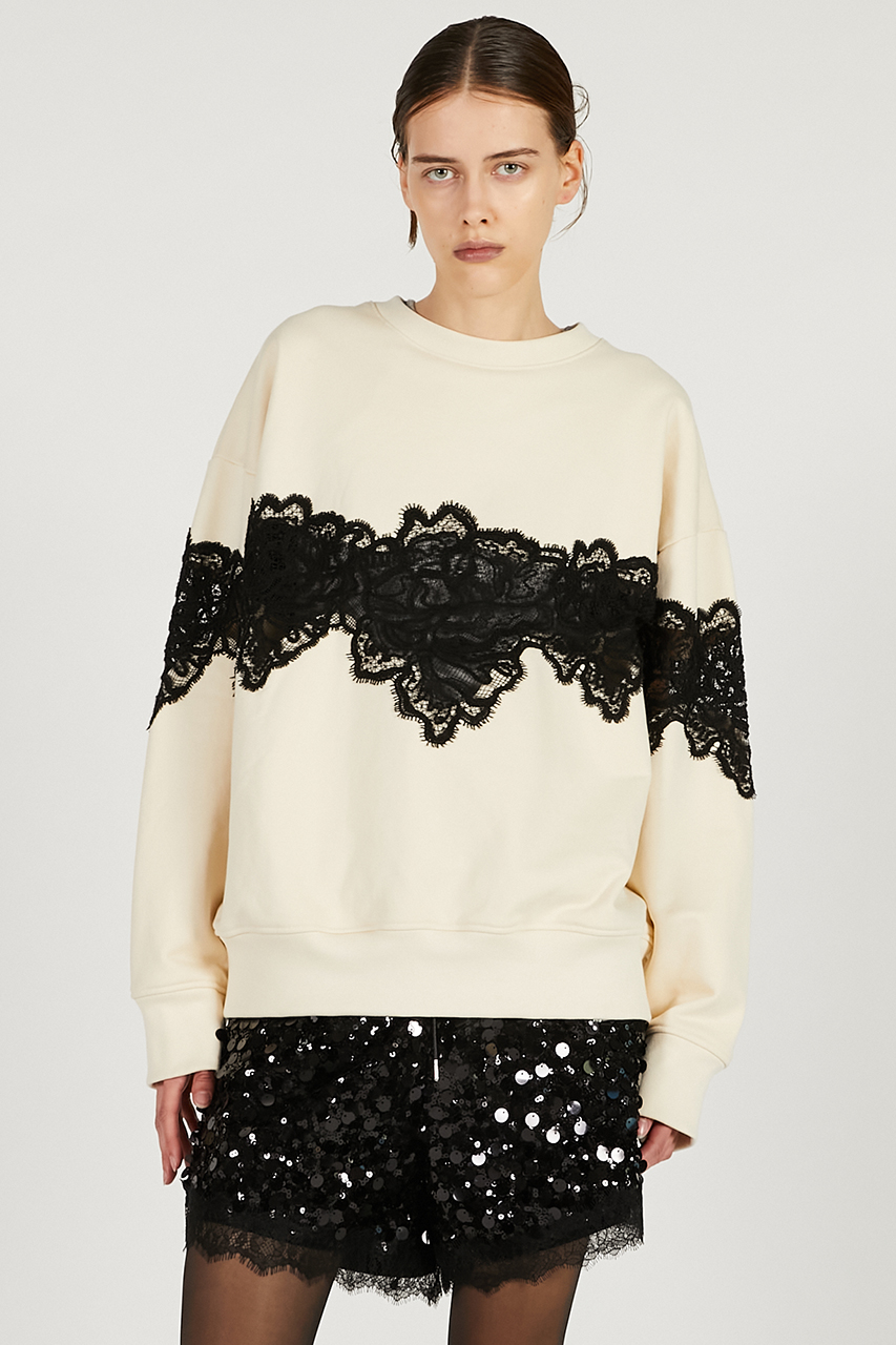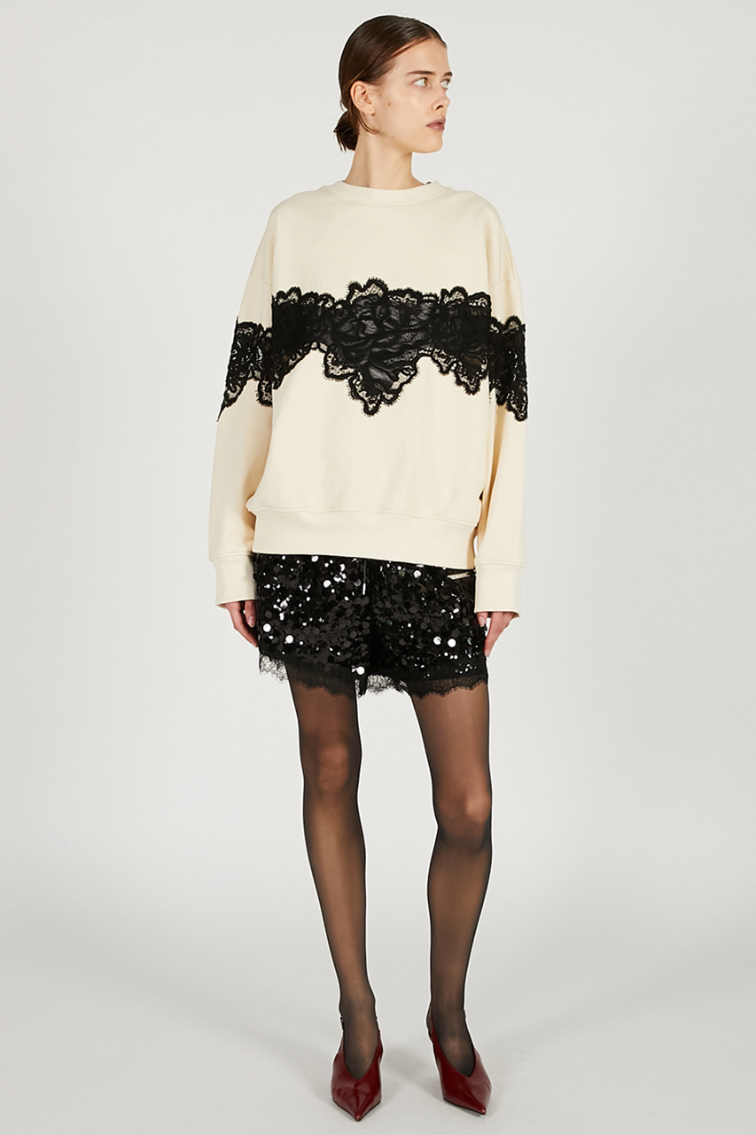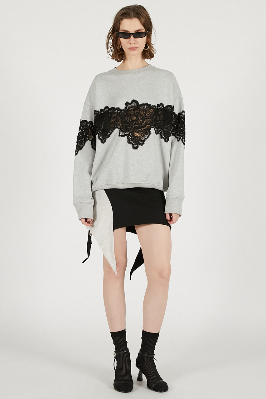 素材にもこだわりが。程よく厚みのあるコットン混スウェットをベースに、前身頃にレースを施すことで立体感と表情をプラス。柔らかく肌触りの良い生地感で快適な着心地を実現し、シーズンを通して長く愛用できる一枚です。