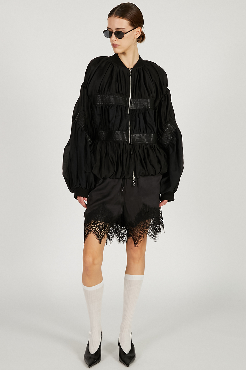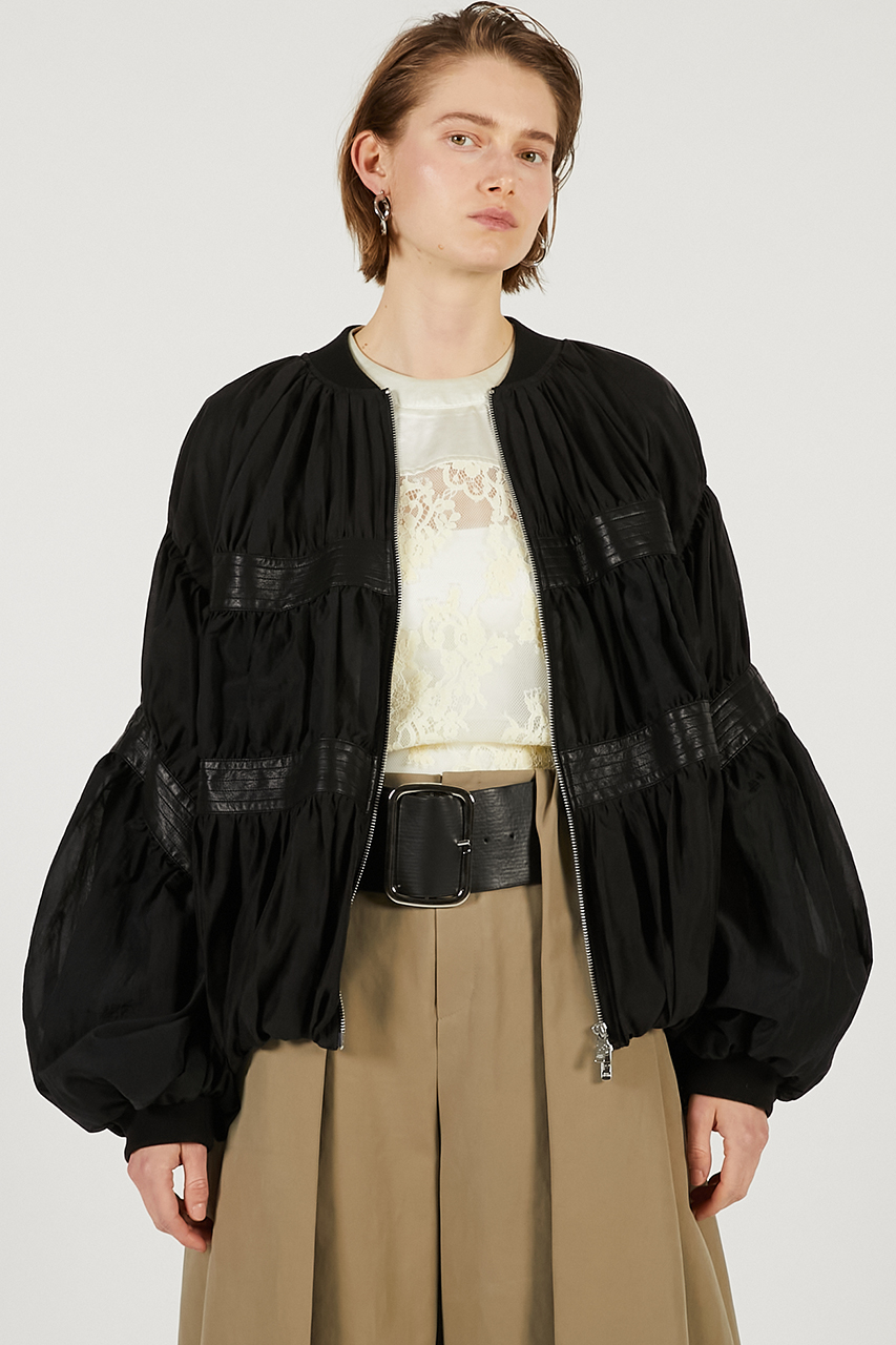 存在感のあるギャザーと異素材の切替が印象的なブルゾン。空気を纏うような立体的でふんわりとしたシルエットが、大人の余裕を感じさせるモードな一着。サイズ感はやや大きめで、インナーを選ばずさっと羽織れるのも魅力。透け感のある素材使いにより、ボリュームがありながらも重たく見えず、軽やかに着用できる。デニムやスーチングアイテムはもちろん、ワンピースの羽織としても好相性。テンセル混のシアー素材やナイロンのシアーリップストップ、軽さのある合皮を組み合わせた異素材ミックスがポイント。
