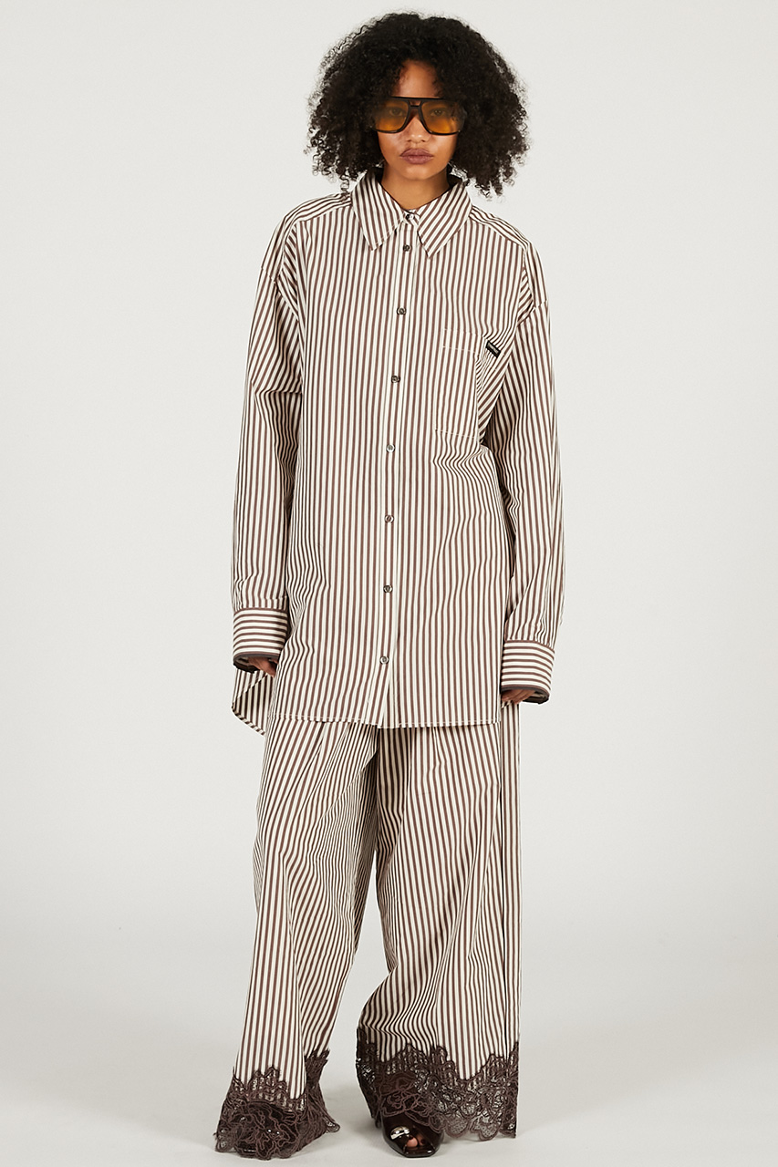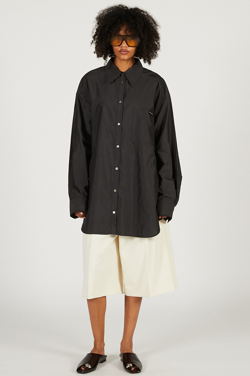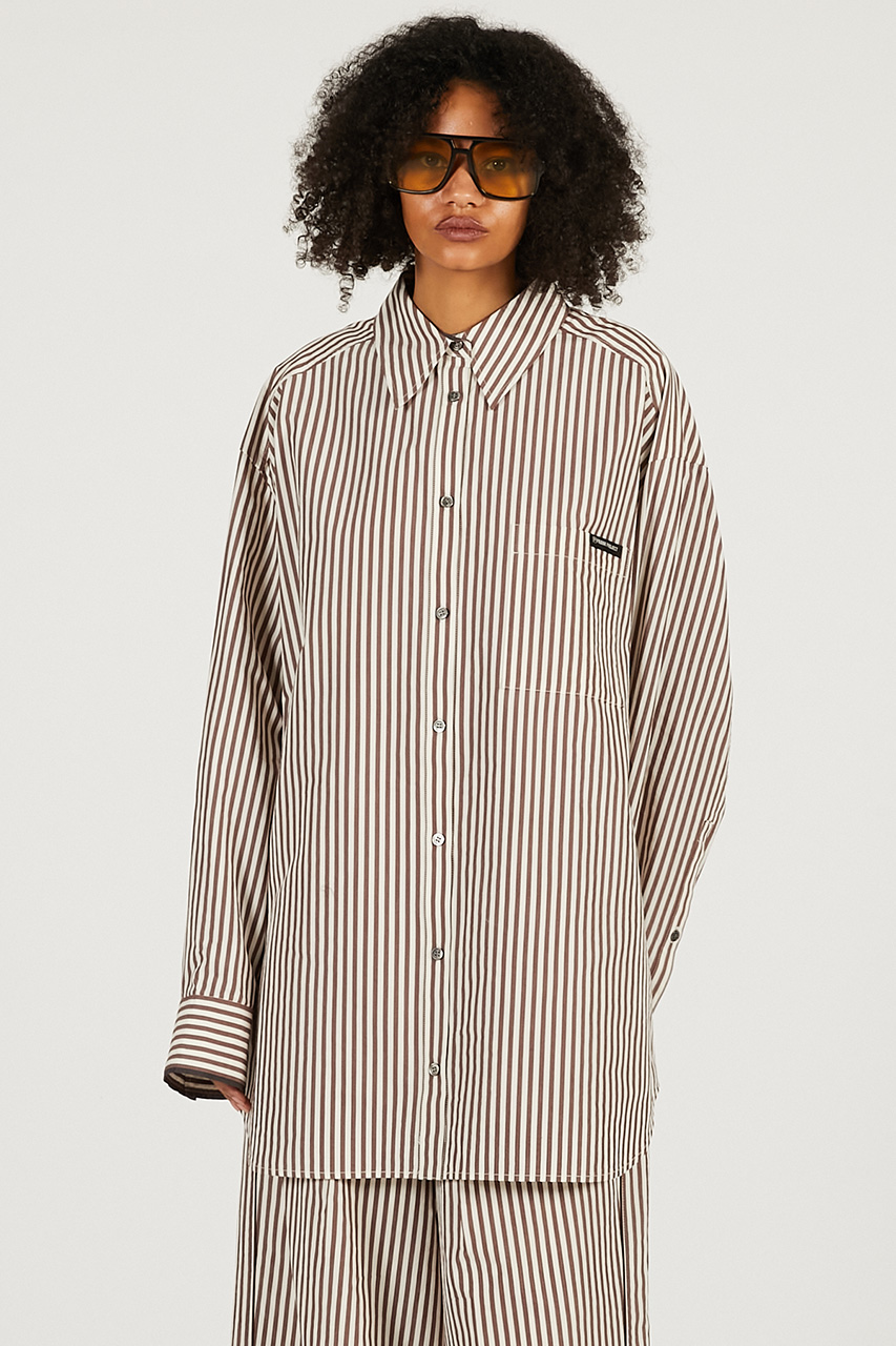 キュプラコットンの素材感を活かした、オーバーサイズのパジャマシャツ。肩の落ちたリラックスシルエットと、やや長めのカフスが洗練された印象を演出し、袖口のライン使いがさりげないアクセントに。サイズ感はゆったりとしており、1枚でも羽織としても様になり、シーズンレスに活躍。後身頃は脇のベルトで留めることでシェイプしたフォルムにアレンジでき、使用しない際はスリットに収納可能。同素材のパジャマパンツと合わせたセットアップなら、楽な着心地ながら一気にお洒落見えが叶う。程よいハリと軽やかさを持つキュプラコットン素材に、マットな艶感が上品さを添え、通年で着用できるのも嬉しいポイント。
