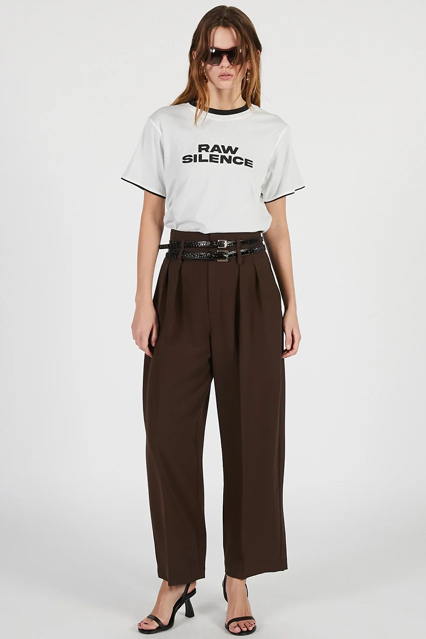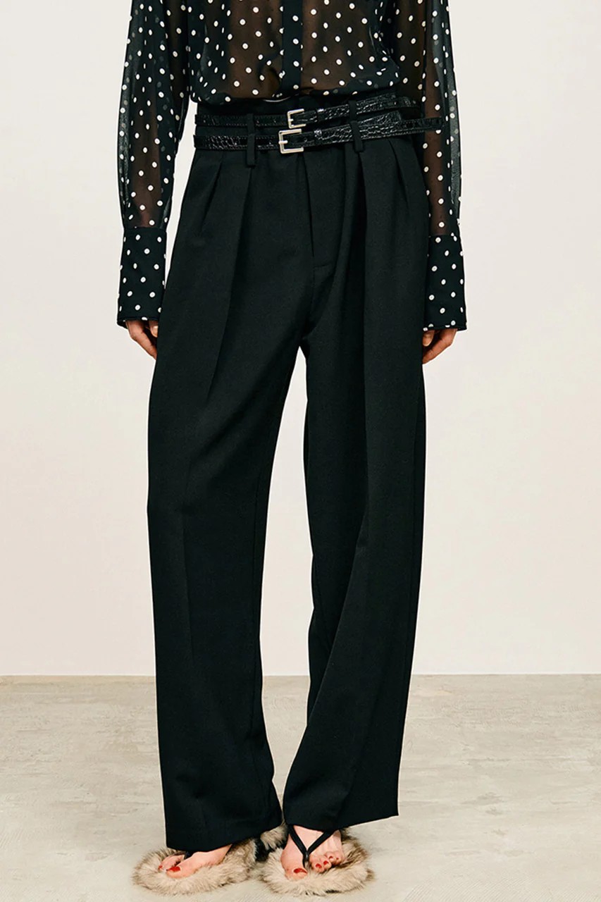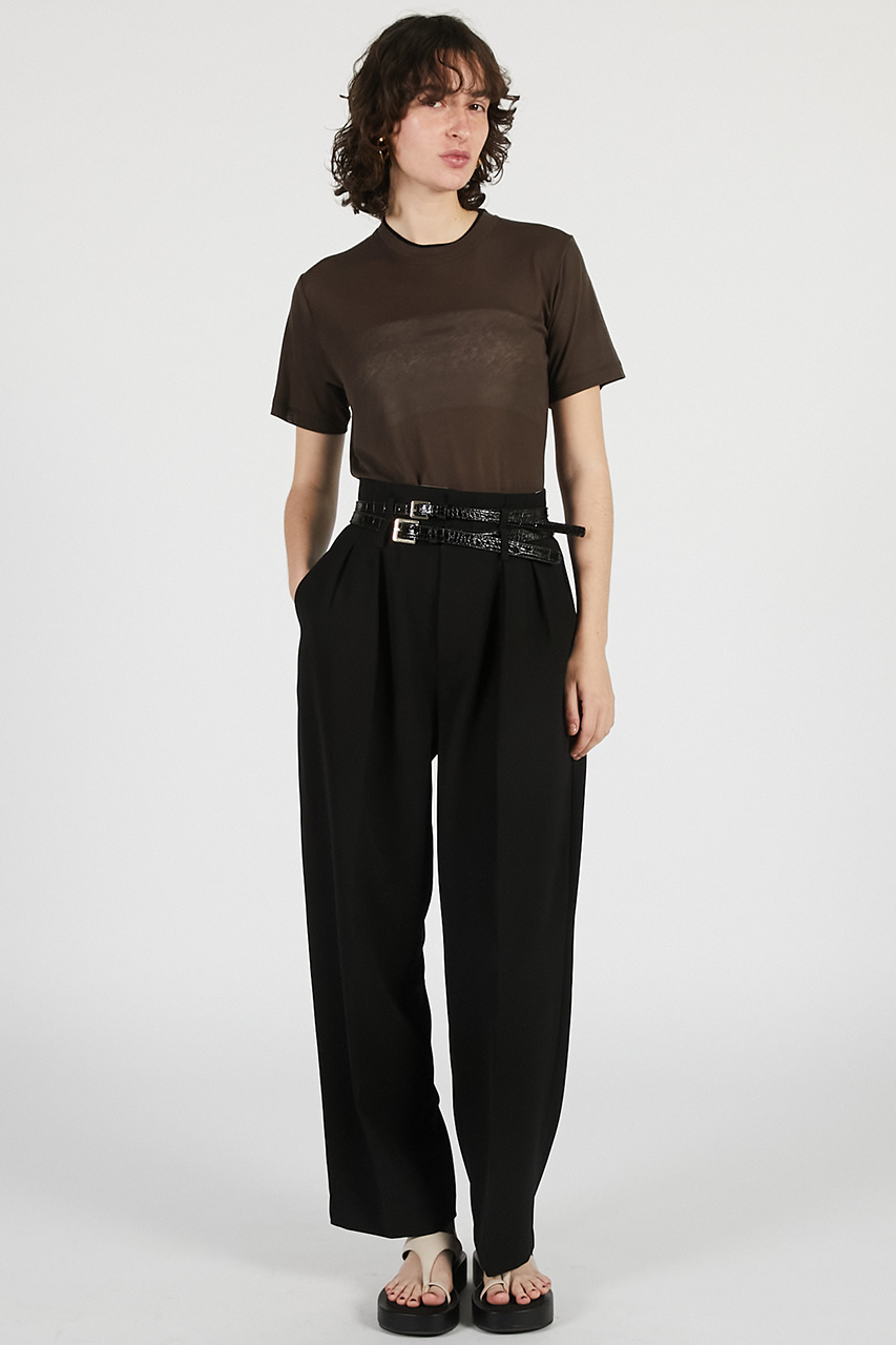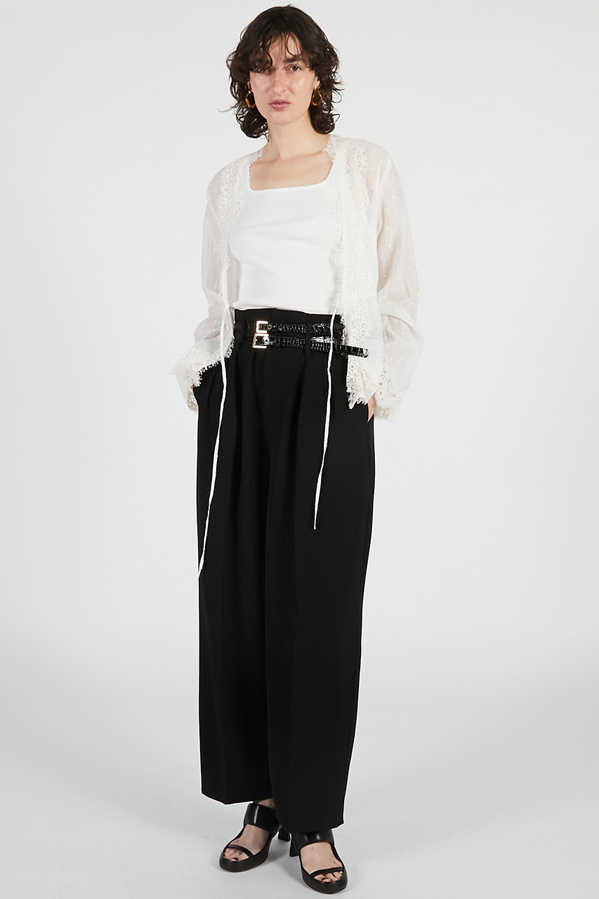 ウエストに施されたダブルベルトディテールが目を惹くストレートパンツ。
