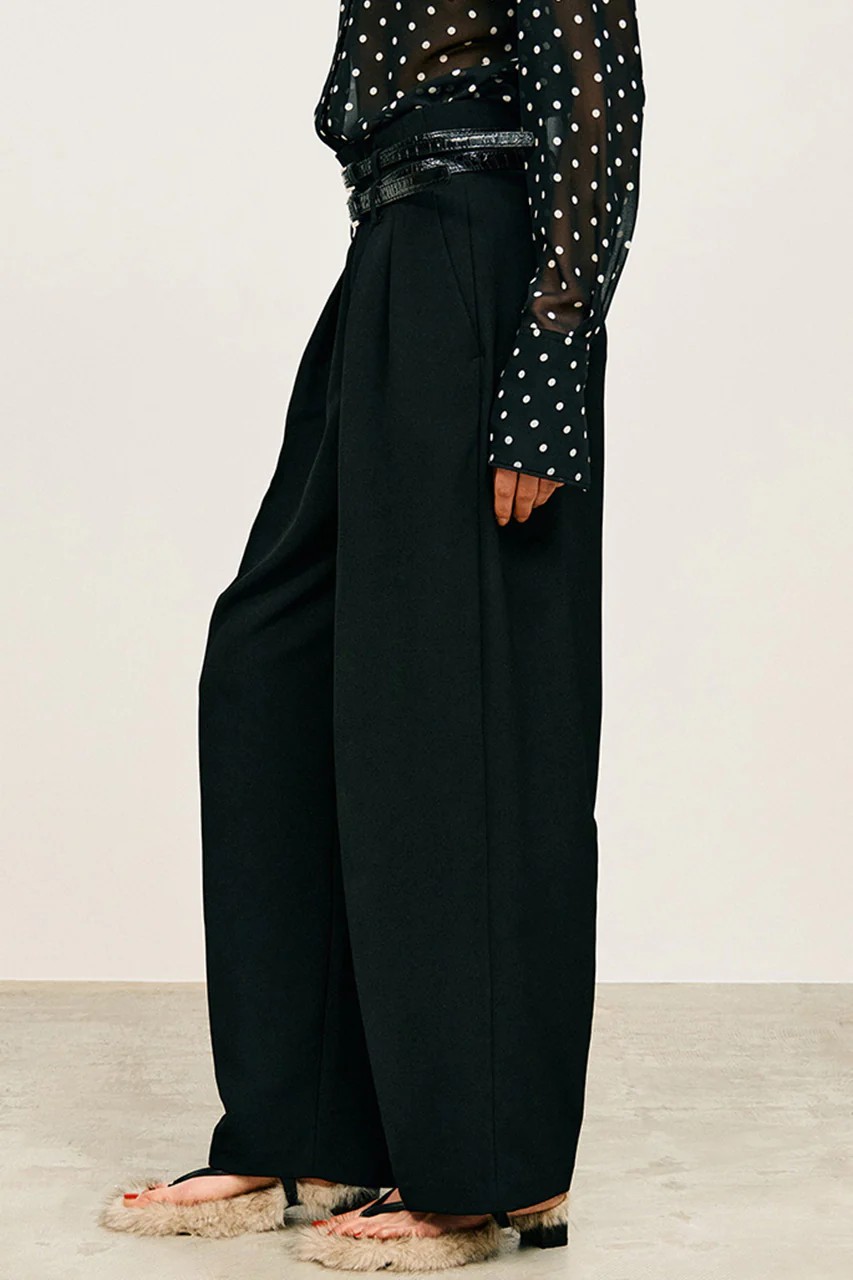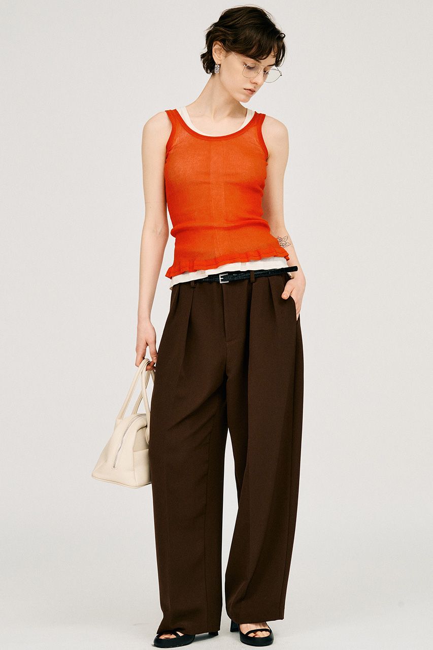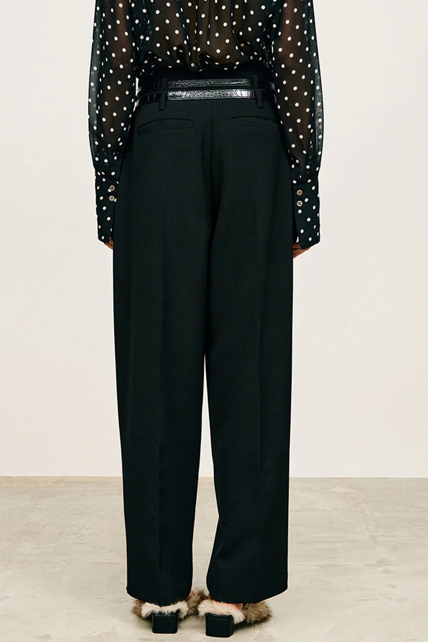 フロントには深めのタックを入れることで、腰回りに立体感を持たせつつ、脚のラインを美しくまっすぐ見せる効果も。