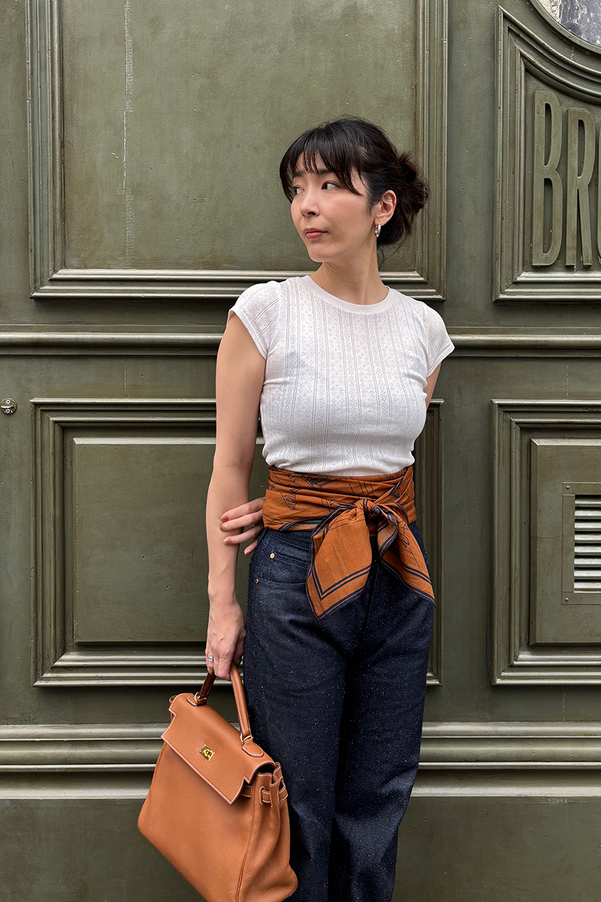 夏には日差しや冷房対策に、秋口には首元に巻いたり、カーディガン代わりとしても活躍。コットンとシルクを織り交ぜた生地は、イタリアのコモで織られた上品な光沢をまといながらも、カジュアルな装いにも自然に馴染む万能さが魅力。