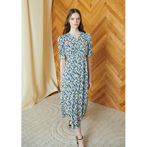 まずは2025年プレ・スプリングコレクションのプリントドレスから。ストレッチ性のあるジャージー素材を使用しており、シワになりにくくフィット感も着心地も抜群です。Vネック、五分袖の適度なパフスリーブも、大人の上品なフェミニンスタイルを演出。“マシュー”柄は、誰もが上品かつ爽やかに着こなせる、フラワープリントのようなグラフィカルパターンです。サンダルを合わせて一枚でさらっと着こなせば、こなれ感満点のリゾートルックに。