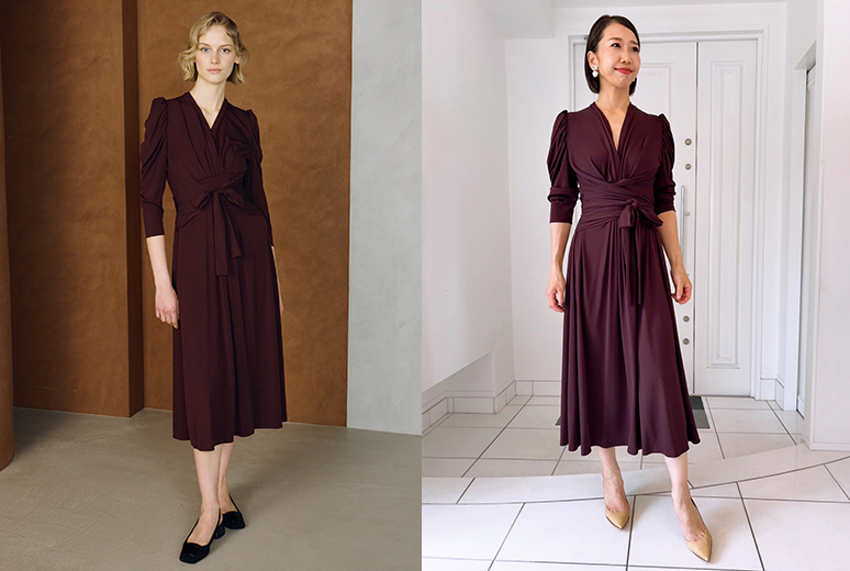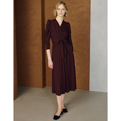 今季のカシュクールドレスは、強撚のドライタッチのトリアセテート素材を使用。肌離れの良いサラッとした風合いは、暑さが残る時期から着用できます。伸縮性が高くストレスフリーな着心地も高ポイント。カシュクールのドレープが体の気になる部分を隠しながら、ウエストラインをすっきりと見せスタイルアップを実現します。バーガンディは肌映りがよく、上品な女性らしさを演出。