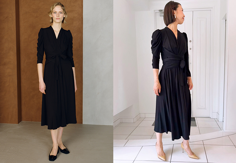 ブラックは細見え効果が高く、シャープな装いを即実現。ジャケットを羽織ったり、パールやゴールドのネックレスをプラスしたりと、スタイリング次第でビジネスからオケージョンシーンまで使えるので、ワードローブに一着あると便利です。足元はパンプスはもちろん、フラットシューズとも好相性。ルックのようにバレエシューズを合わせると、粋なフレンチシック風スタイルに。