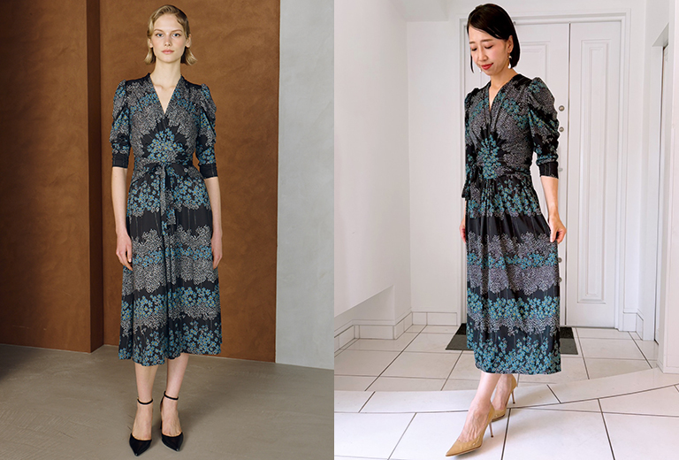 アイコニックなカシュクールドレスには華やかなプリントともベストマッチ。“ロシェ”柄は、モノトーンにブルーの小花を美しく配置したデザイン。ウエストや裾にかけて柄のパターンを計算して配置することで、一層着映えとスタイルアップ効果を高めています。こちらもジャケットを羽織ればフォーマルなシーンにも活躍。