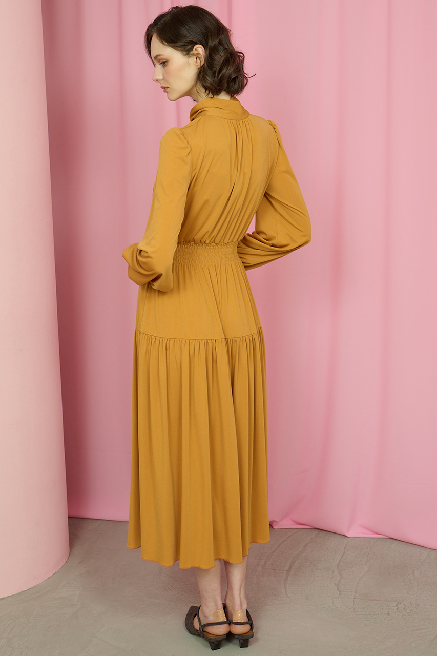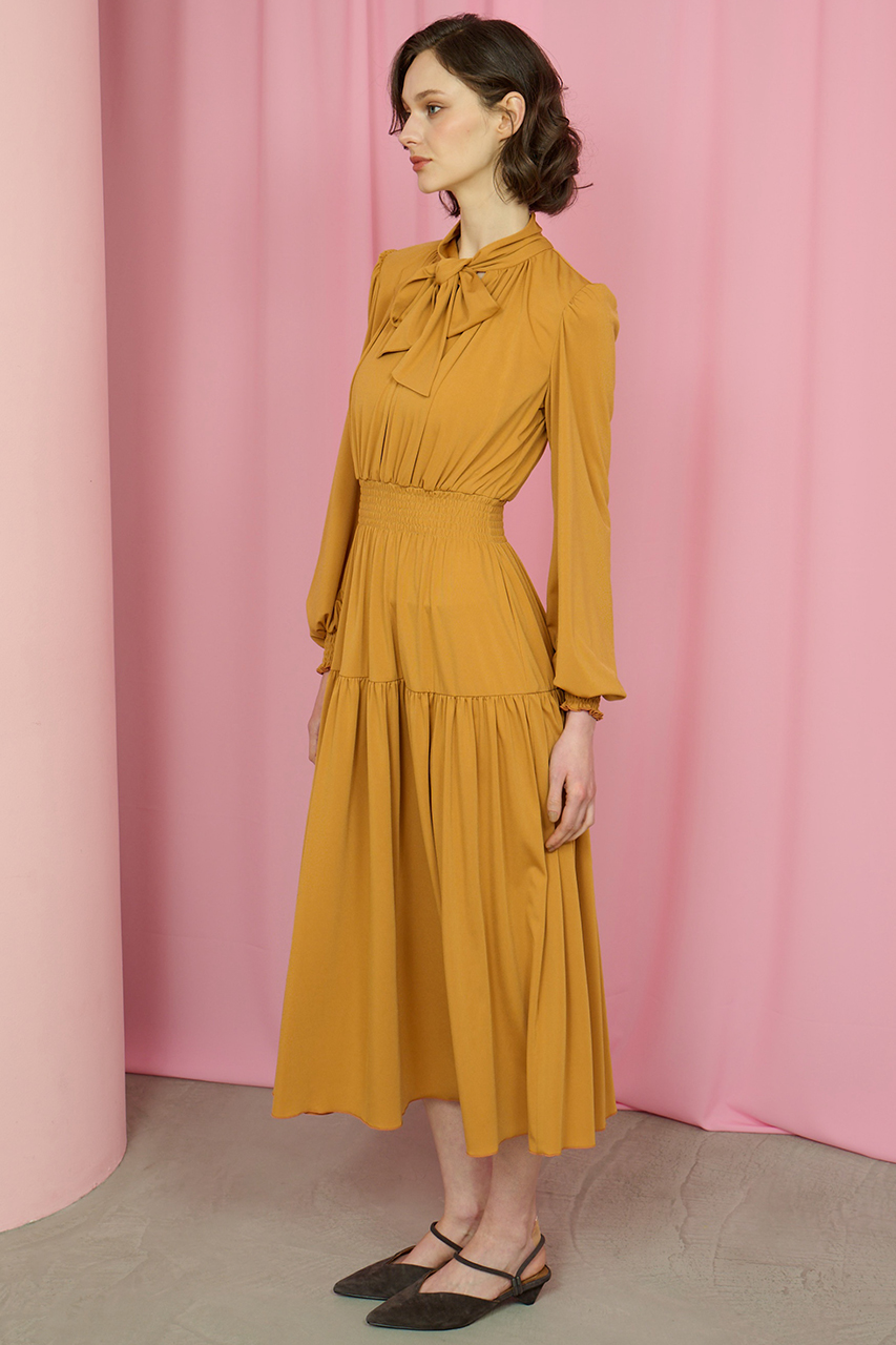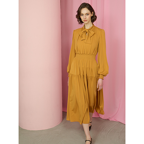 秋へのスイッチスタイルとしてまずはマークしたい「コルコバード」で定番人気のボウタイリボンドレス。ウエストのゴムギャザーが着心地の良さとスタイルアップ効果を発揮し、リラックスした気分でメリハリのある女性らしいおしゃれを叶えます。ふくらはぎが隠れる程度の絶妙な丈感は、パンプスからバレエシューズ、スニーカーまでさまざまな足元と好相性。肌離れの良い風合いが素材は、 伸縮性が高くストレスフリーな着心地です。肌に上品に映える“マンゴー”が、この秋冬のいち押しカラー。着る人を驚くほどパッと明るく見せてくれます。
