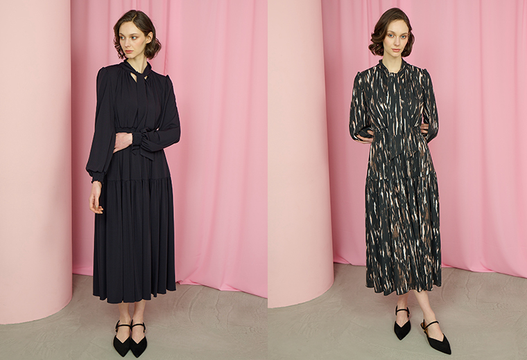 ボウタイリボンドレスの研ぎ澄まされたデザインをより際立たせるのがネイビー。今季は裾のヘムラインをストレートにし、より落ち着いた印象に仕上げています。縦縞をデフォルメした幾何学柄“オランジェット”も注目の新柄。ボディラインをすっきりと見せ、これ一枚で洗練された装いを叶えます。どちらも上からジャケットを羽織れば、きちんとしたオケージョンにパーフェクトに対応。