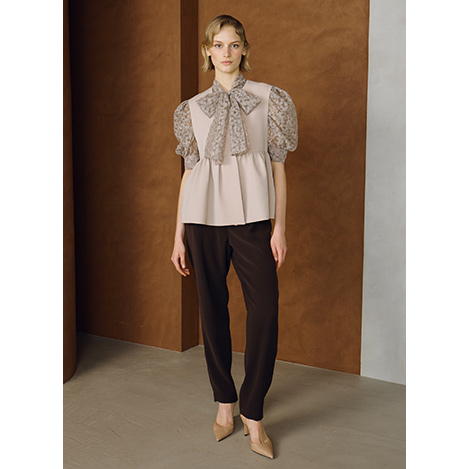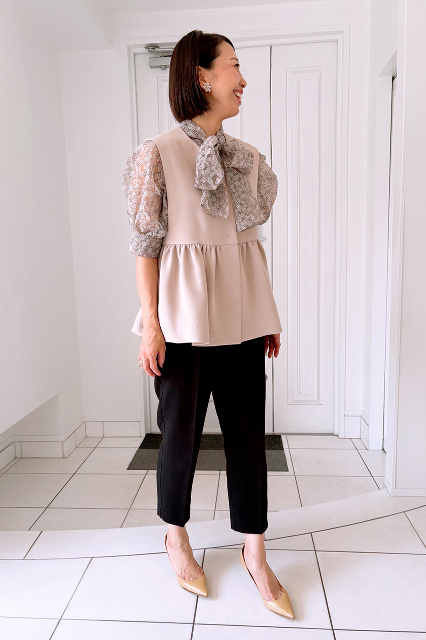 甘すぎないすっきりとしたぺプラムシルエットが、大人の女性に似合うキーポイント。あえて比翼仕立てにすることで、より縦のラインが強調されて、上半身をほっそりと見せます。これからの時期、ブラウスはもちろんロンTやニットと合わせるのも◎。コートのインにして、小粋なレイヤードを楽しむのもすてきです。