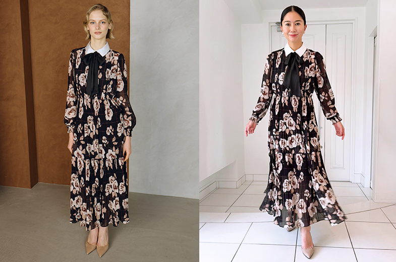 ほのかに透け感のあるポリエステルシフォンにクラシカルな柄をあしらったプリントドレス。白襟とボウタイの黒、ヘムラインのパネルデザインがポイントになって、メリハリのある印象に。すっきりとしたシルエットで、スタイルアップも叶えます。ちょっとしたお出かけからスペシャルなイベントまで大活躍。ブラウントーンなのでど雰囲気のあるおしゃれに仕上がります。