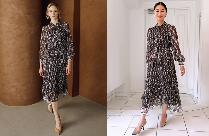 毎シーズン人気のボウタイリボンドレスをシフォン素材で製作。上品なシアー感の生地にブラウンのジオメトリック柄をプリントし、どこかノスタルジックな美しさを表現しています。プリーツの縦のラインがほっそり見えを叶え、ふわりと落ちるシルエットが女性らしさをアップ。ジャケットを羽織ればきちんとしたシーンにも対応します。