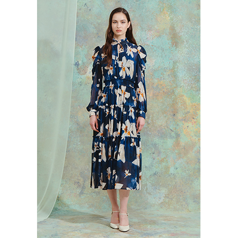 深みのあるブルーに百合の花が咲き誇る、これ以上ないほどの洗練と華やかさを備えたプリントドレス。ポリエステルシフォンをベースにしており、ふわっとした肌離れの良さも魅力です。落ち感の良いシアーな風合いが柄のインパクトを抑え、どんな人にもしっくりなじんでくれます。