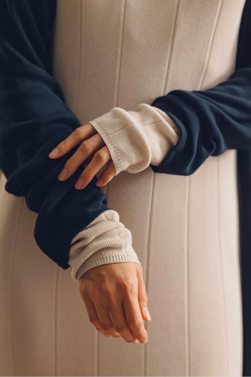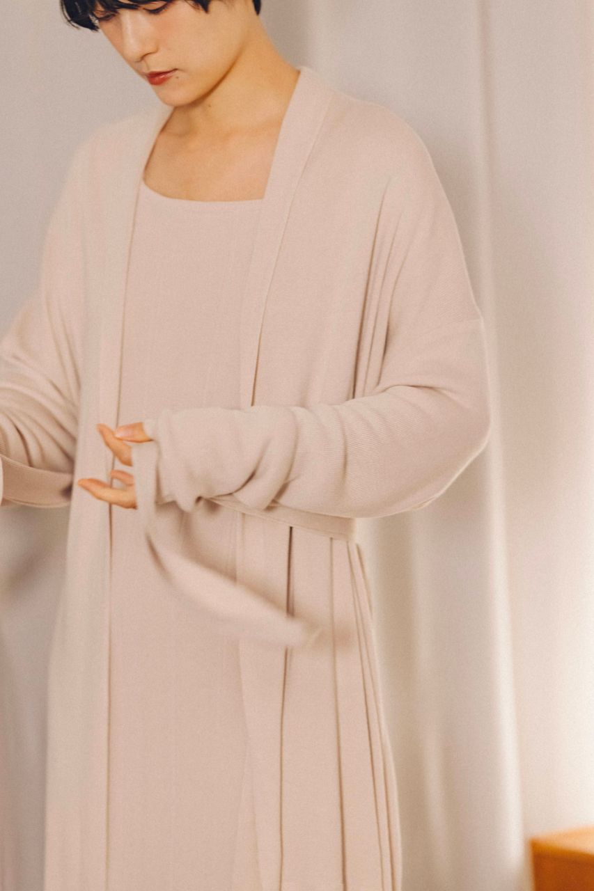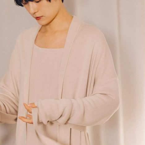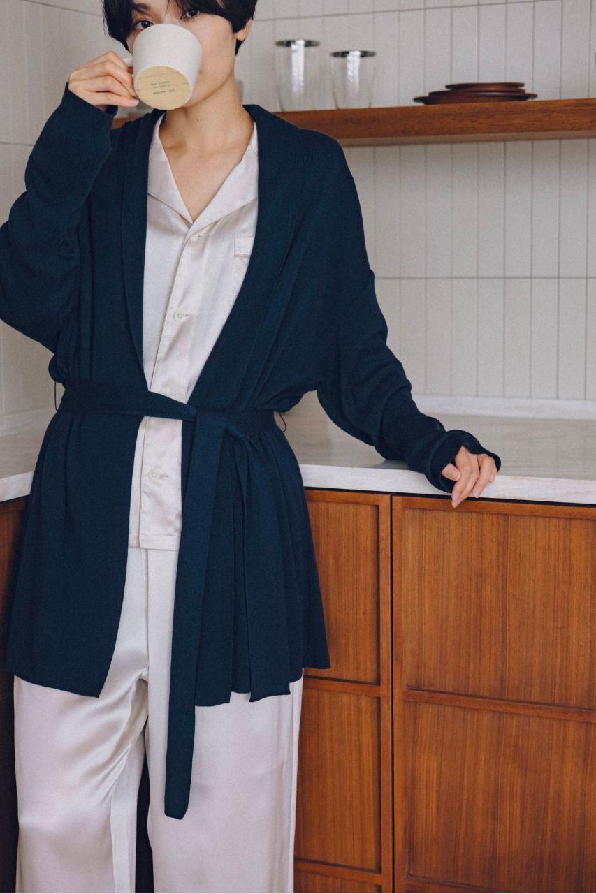 「フートウキョウ」を象徴するシルクをブレンドした、滑らかで肌に優しい、伸縮性のあるローブニットカーディガン。肌寒い季節に、シルクパジャマの上から羽織るものが欲しいというお客様のご要望から生まれました。