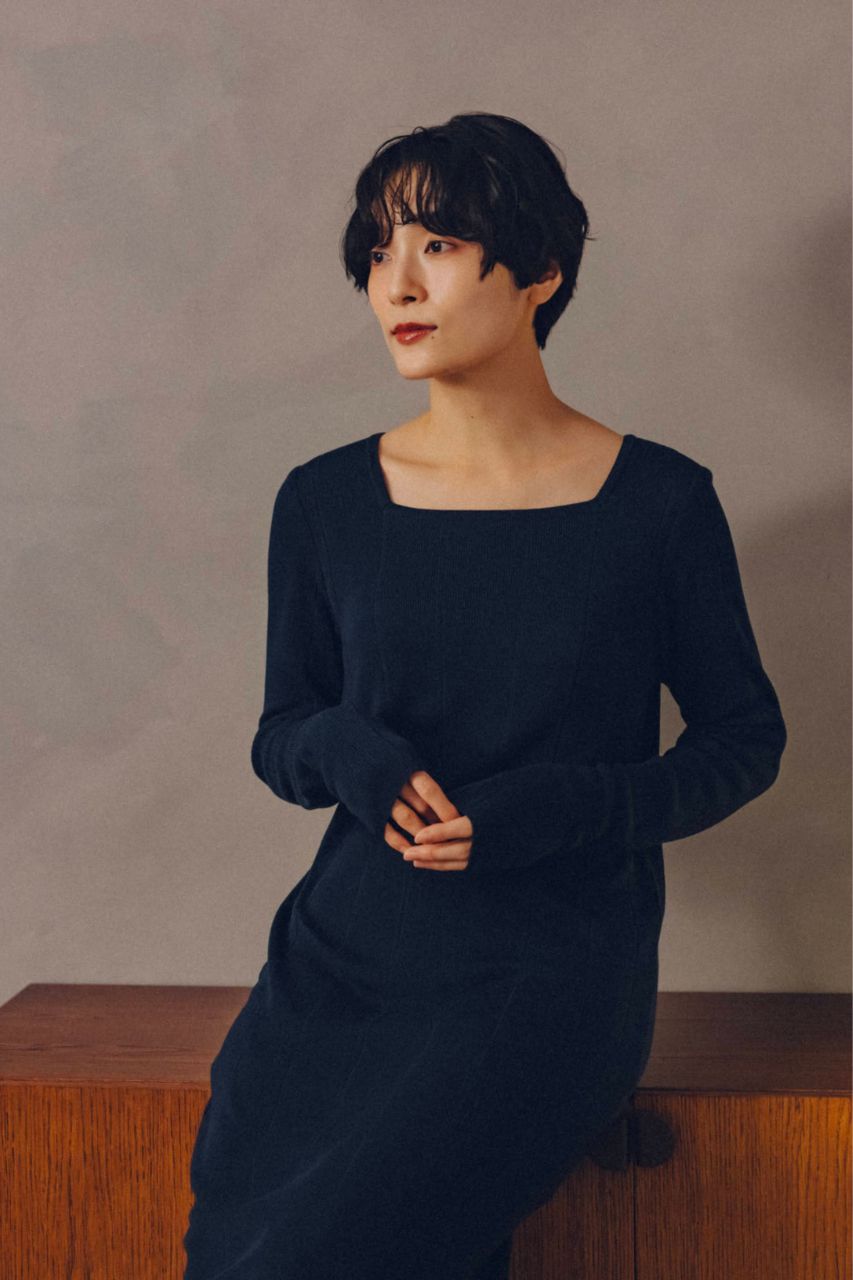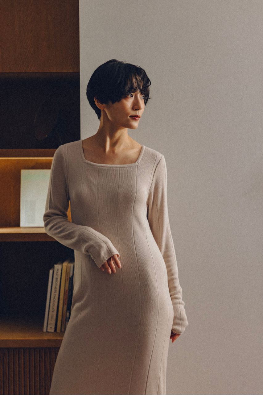 デコルテをすっきりと美しく見せるスクエアネックのシルクブレンドリブニットワンピース。
