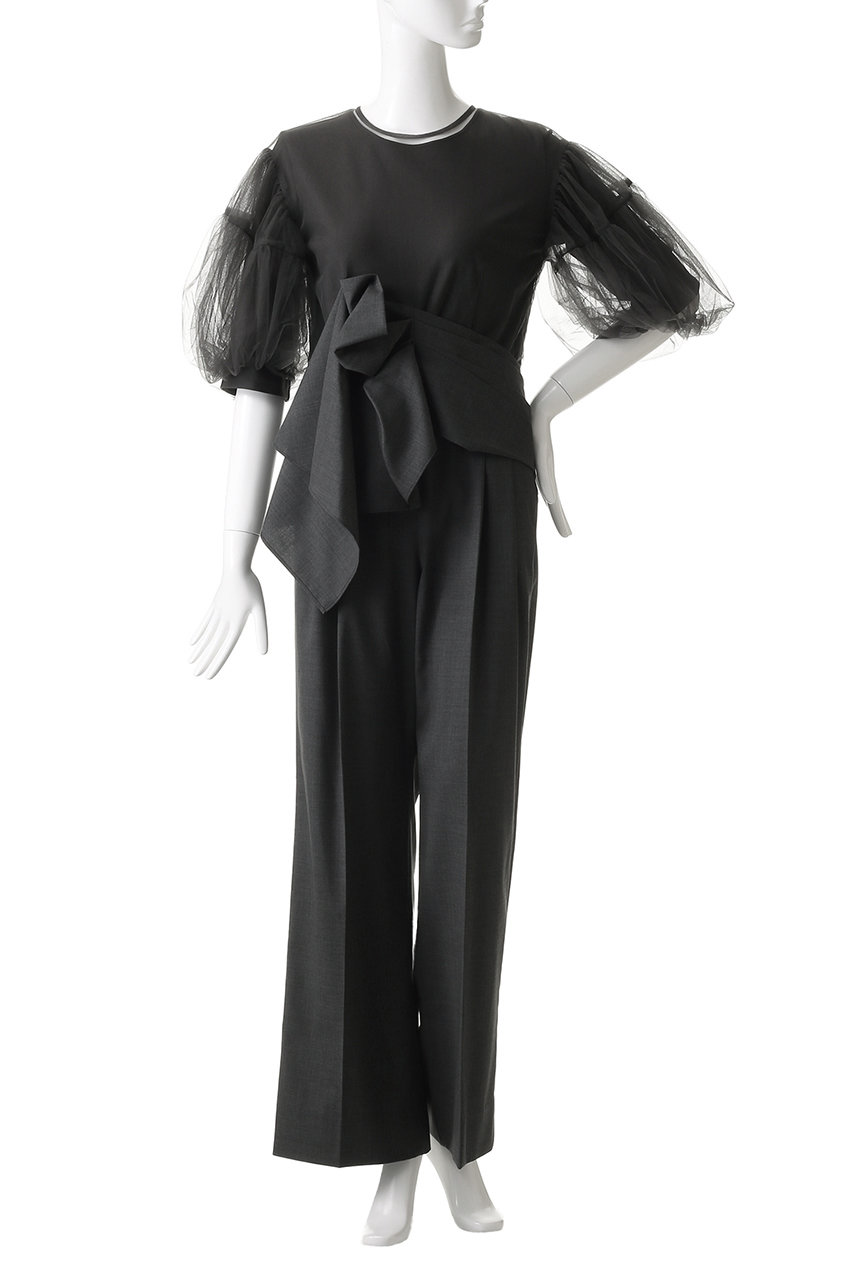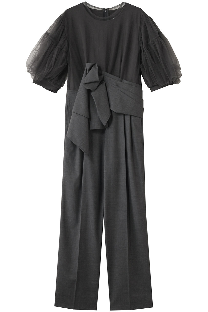 華やかなトップスとパンツをコーディネートしたかのような洗練されたデザインがおしゃれ心惹かれるオールインワン。繊細な透け感のあるチュール素材のパフスリーブがドレッシーな印象ながら、ウエストのタックディテールがモード感を演出。