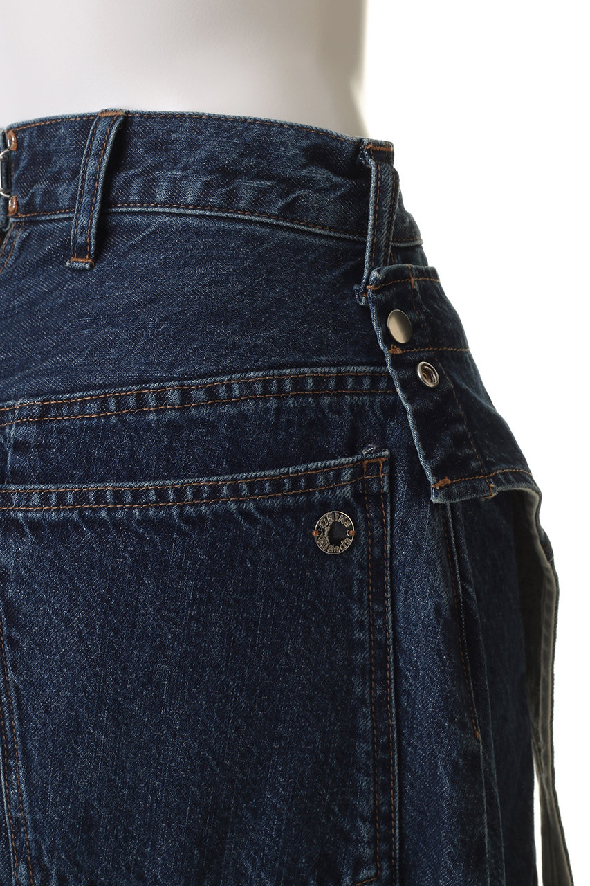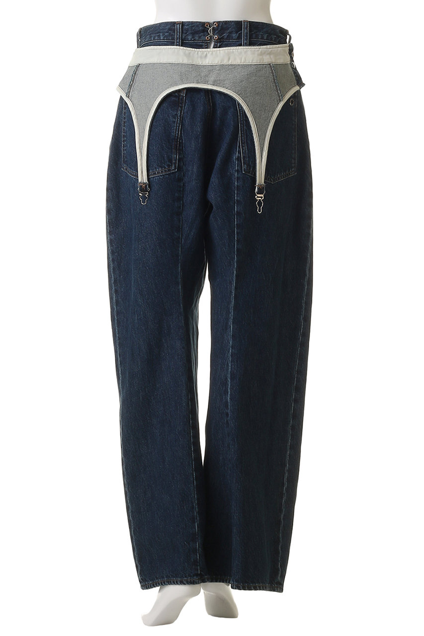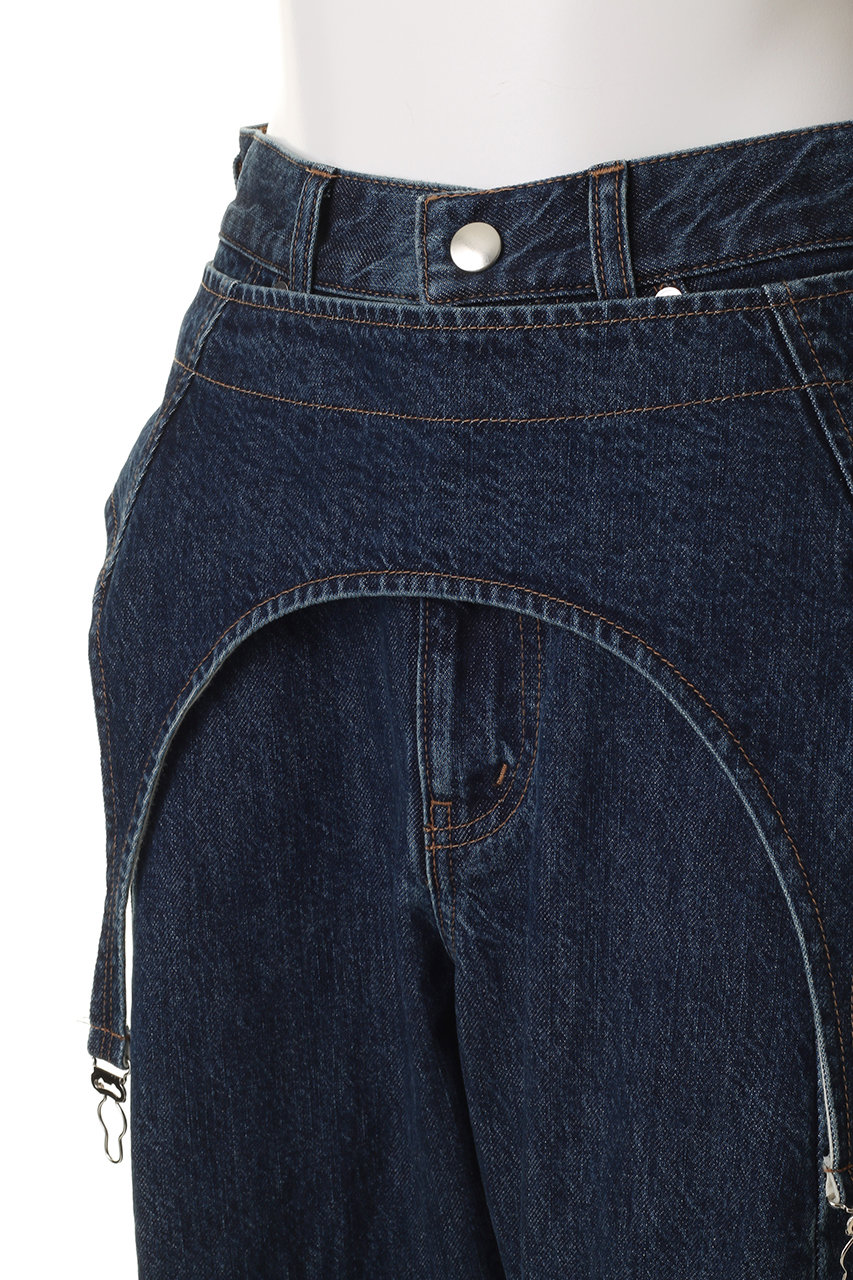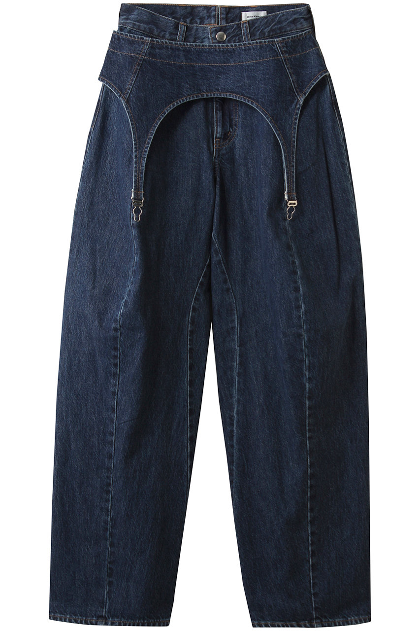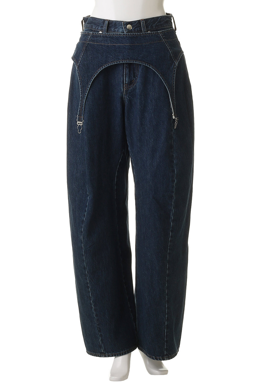 「チカキサダ」のトップスにあわせたいおすすめのデニムパンツはこちら。計算された切り替えデザインや美しい曲線ラインがおしゃれ度を上げてくれます。取り外し可能なガーターベルトデザインでデニムコーデを上級者にシフト。