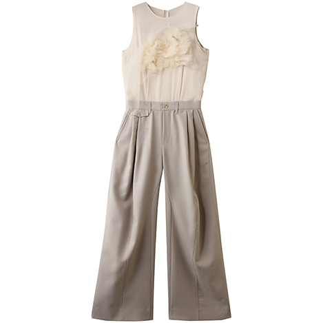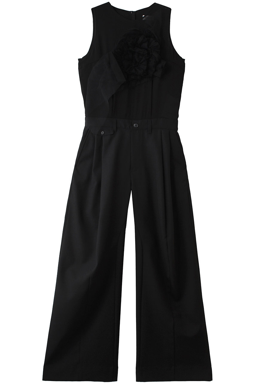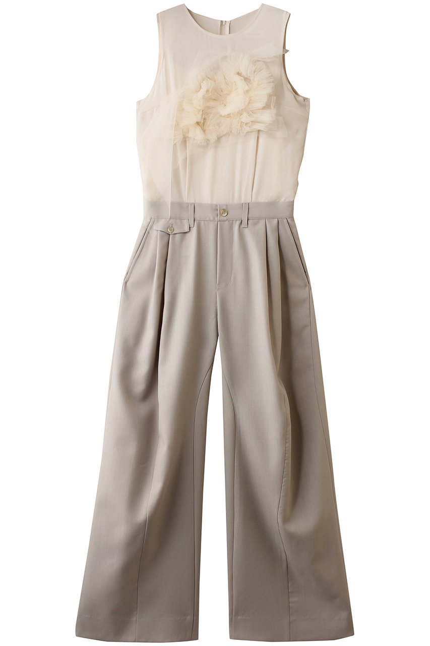 デイリーからオケージョンシーンまで幅広く対応してくれる、ノースリーブのコンビネゾン。華やかなチュールトップスと、きちんと感のあるパンツとのメリハリが効いたドッキングデザインが魅力的。これだけでコーディネートが決まる優秀アイテムだから、ワードローブに押さえておきたい。