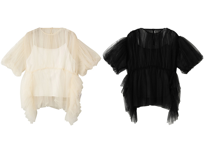 装いにモダンなエッジとロマンチックムードをもたらす主役顔ブラウス。ぜいたくにあしらった繊細でエアリーなチュール素材が芸術品のような美しさを纏う1着。素肌をほんのりのぞかせる透け感が、女性らしいセンシュアルな魅力を放って。モードな装いからドレスアップまで大本命に選びたい。※インナー付属あり。