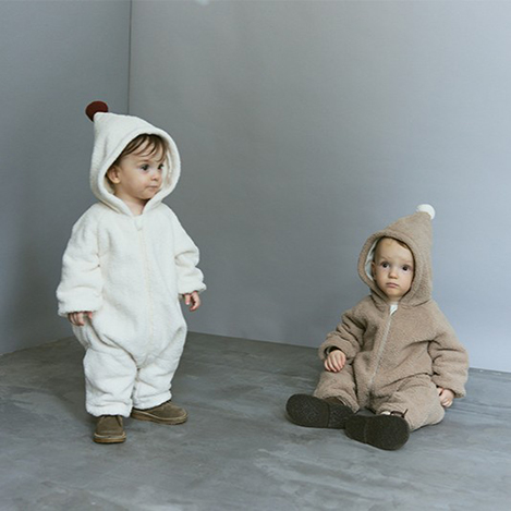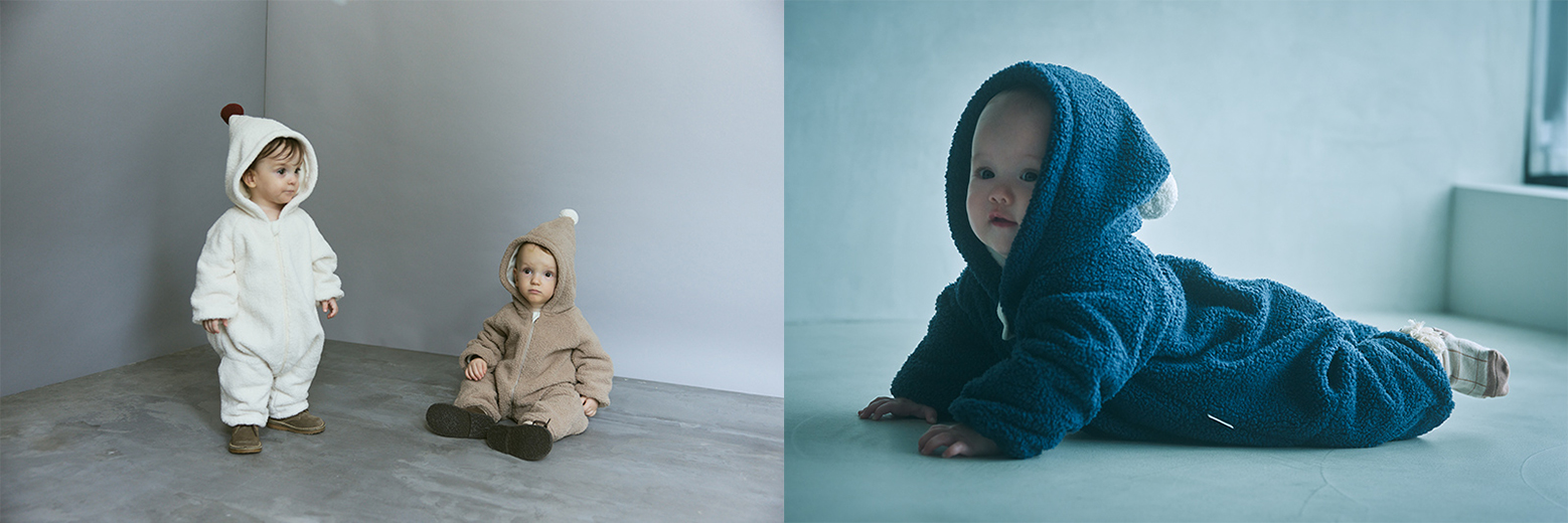 まるごと可愛く包むオールインワンアウター。ふわふわのボア素材が、まるでペアレンツのハグのようにやさしくつつみます。逆開ファスナーで上下どちらにも開き、お着替えやオムツ替えも簡単。インナーの袖は手足を包み込むカバーにも変化します。袖や着丈を調節できるゴムストッパー付きで、ワンサイズでも20cmの成長に対応可能。