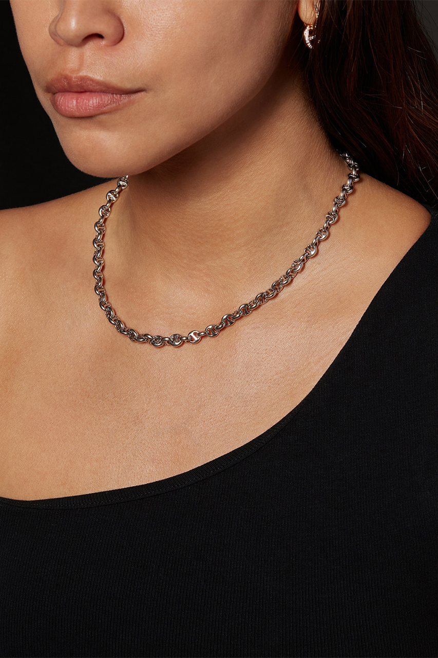 程よいボリューム感の5mmコマを使用した16インチ(約39.5cm)のネックレス。鎖骨のあたりにちょうど収まり、首元にフィットする短めの長さがモードな印象。デコルテラインを美しく魅せてくれます。