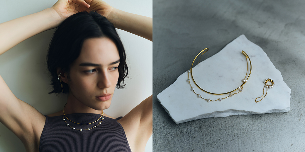 チョーカーとチェーンを重ねたように見せる「プラス ヴァンドーム」の人気デザインを、淡水パールでアレンジ。華奢なチェーンには粒ごとに表情の異なる有機的なパールを絶妙な間隔で配し、抜け感がありながらも上品な印象に。シャープなメタルチョーカーとのコントラストがモダンなムードを引き寄せ、顔まわりにトレンド感と奥行きをプラスします。チョーカーとチェーンはあらかじめ固定されているため、重ねづけがしやすく、着脱のしやすさや軽やかな着け心地も魅力。