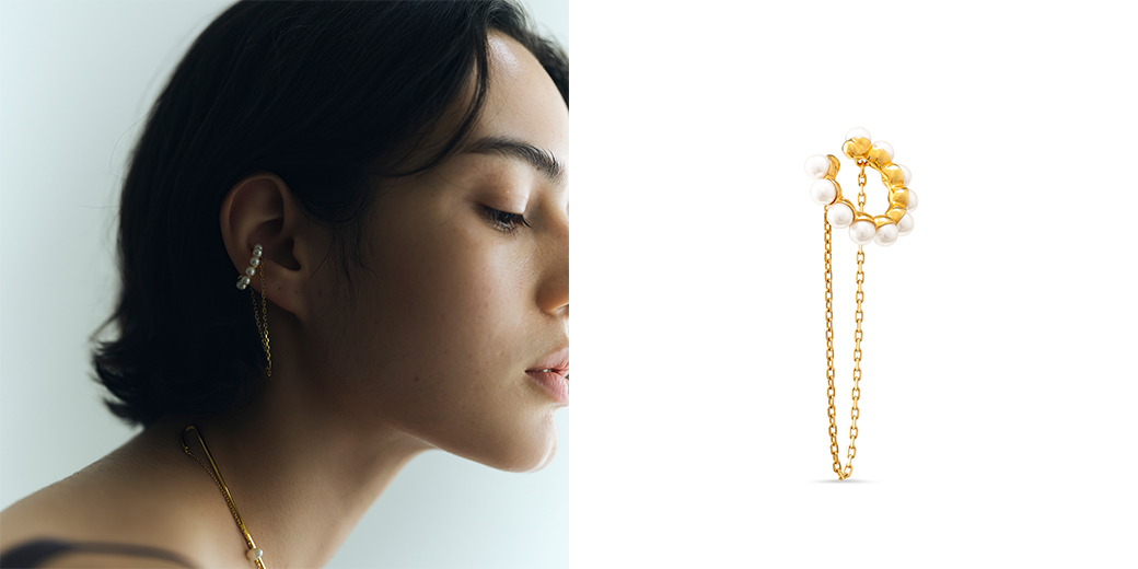 片耳用イヤーカフは、粒感が際立つパールリングに華奢なチェーンをあしらったレイヤード風デザイン。顔まわりを華やかに彩るパールと、動くたびにきらめきを放つメタリックチェーンが、モードな表情を添えます。カジュアルなデニムからドレスアップまで、幅広いシーンでスタイリングのアクセントとして活躍するアイテム。