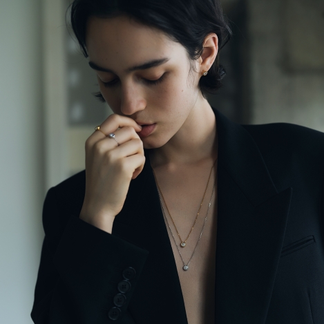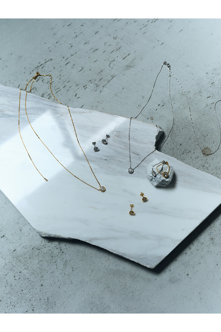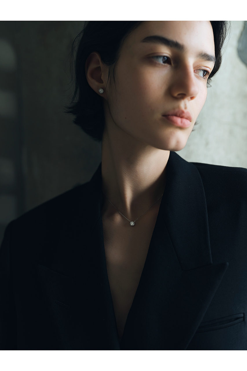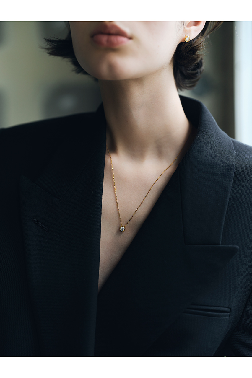 直径4.8㎜のラウンド・ブリリアン・カットの“合成モアッサナイト”を国内最大の宝飾産地、山梨県甲府の職人が丁寧にセッティング。チェーンはあえて長めの70㎝にスライドアジャスター付きで、チョーカーからロングネックレスまで幅広く楽しめる抜群の汎用性が魅力です。K18イエローゴールドのコーティングが華やかなゴールドに加え、石の大きさがより際立つのシルバーも登場。