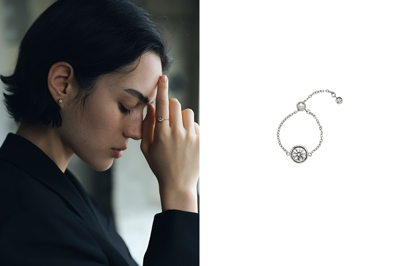 ネックレス同様、ラウンド・ブリリアン・カットの“合成モアッサナイト”を採用。華奢なチェーンと大粒のモアッサナイトの絶妙なバランスが特徴で、キラリと輝くモアッサナイトが手元を一気に明るく引き立てます。スライドアジャスター付きのチェーンリングで、約20号までサイズ調整が可能。ピンキーリングやファランジリングとして着けたり、レイヤードスタイルにもぴったりです!