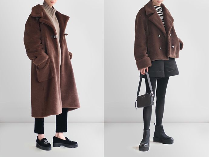 ふわふわ、もこもこの洗える冬素材でデビューした新作コート“Teddy Teddy Long & Short”は、ロング丈とショート丈の展開をご用意。ボリュームと高級感のあるアウターで、どちらもウォッシャブルなのがうれしいサプライズ。デイジーショコラは、よりテディベアのようなチャーミングな魅力あふれるカラーリング。軽量であたたかく、腕をどこまでも前に伸ばせそうなほどの抜群のストレッチ性があるので、毎日羽織りたくなるほど快適。レザーベルトの留め方次第で襟元のアレンジが自在なロング丈と、トレンド感が高くボトムとバランスの取りやすいショート丈。シンプルなスタイルに羽織るだけで印象的なスタイルを叶えます。