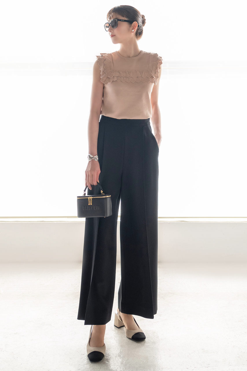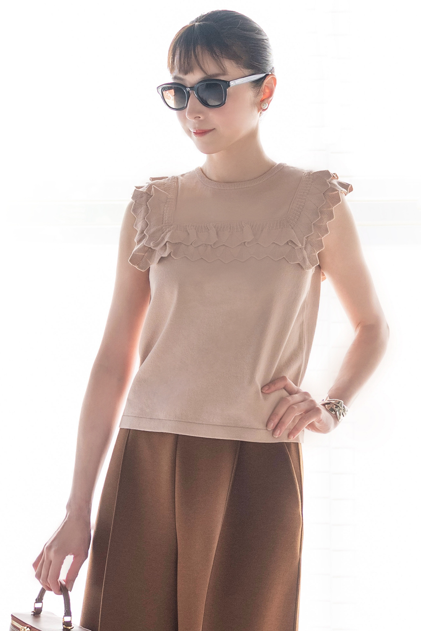 顔まわりを彩るフリルと透かし編みが、華やかさと小顔効果をプラスするニットトップス。